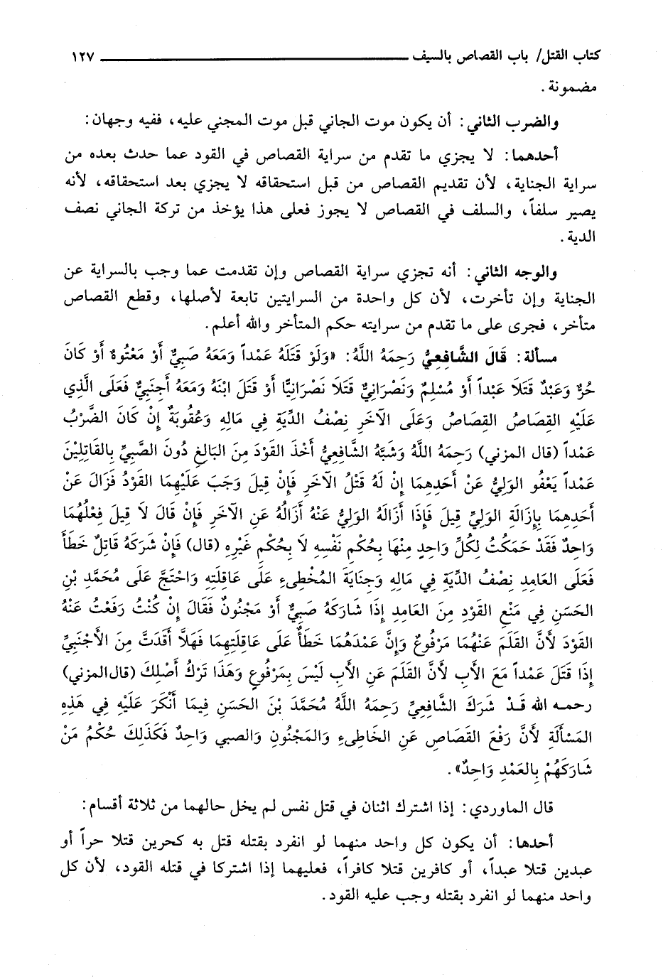 قال الشَّافِعِيُّ رَحِمَهُ اللَّهُ: " وَلَوْ قَتَلَهُ عَمْدًا وَمَعَهُ صَبِيٌّ أَوْ مَعْتُوهٌ أَوْ كَانَ حُرٌّ وَعَبْدٌ قَتَلَا عَبْدًا أَوْ مُسْلِمٌ وَنَصْرَانِيٌّ قَتَلَا نَصْرَانِيًّا أَوْ قَتَلَ ابْنَهُ وَمَعَهُ أَجْنَبِيٌّ فَعَلَى الَّذِي عَلَيْهِ الْقِصَاصُ الْقِصَاصُ وَعَلَى الْآخَرِ نِصْفُ الدِّيَةِ فِي مَالِهِ وَعُقُوبَةٌ إِنْ كَانَ الضَّرْبُ عمداً (قال المزني) رحمه الله وشبه الشافعي أخذ القود من البالغ دون الصبي بالقاتلين عمداً يعفو الولي عن أحدهما إن له قتل الآخر فإن قيل وجب عليهما القود فزال عن أحدهما بإزالة الولي قيل فإذا أزاله الولي عنه أزاله عن الآخر فإن قال لا قيل فعلهما واحد فقد حكمت لكل واحد منها بحكم نفسه لا بحكم غيره (قال) فإن شركه قاتل خطأ فعلى العامد نصف الدية في ماله وجناية المخطئ على عاقلته واحتج على محمد بن الحسن في منع القود من العامد إذا شاركه صبي أو مجنون فقال إن كنت رفعت عنه القود لأن القلم عنهما مرفوع وإن عمدهما خطأ على عاقلتهما فهلا أقدت من الأجنبي إذا قتل عمداً مع الأب لأن القلم عن الأب ليس بمرفوع وهذا ترك أصلك (قال المزني) رحمه الله قد شرك الشافعي رحمه الله محمد بن الحسن فيما أنكر عليه في هذه المسألة لأن رفع القصاص عن الخاطئ والمجنون والصبي واحد فكذلك حكم من شاركهم بالعمد واحد ".