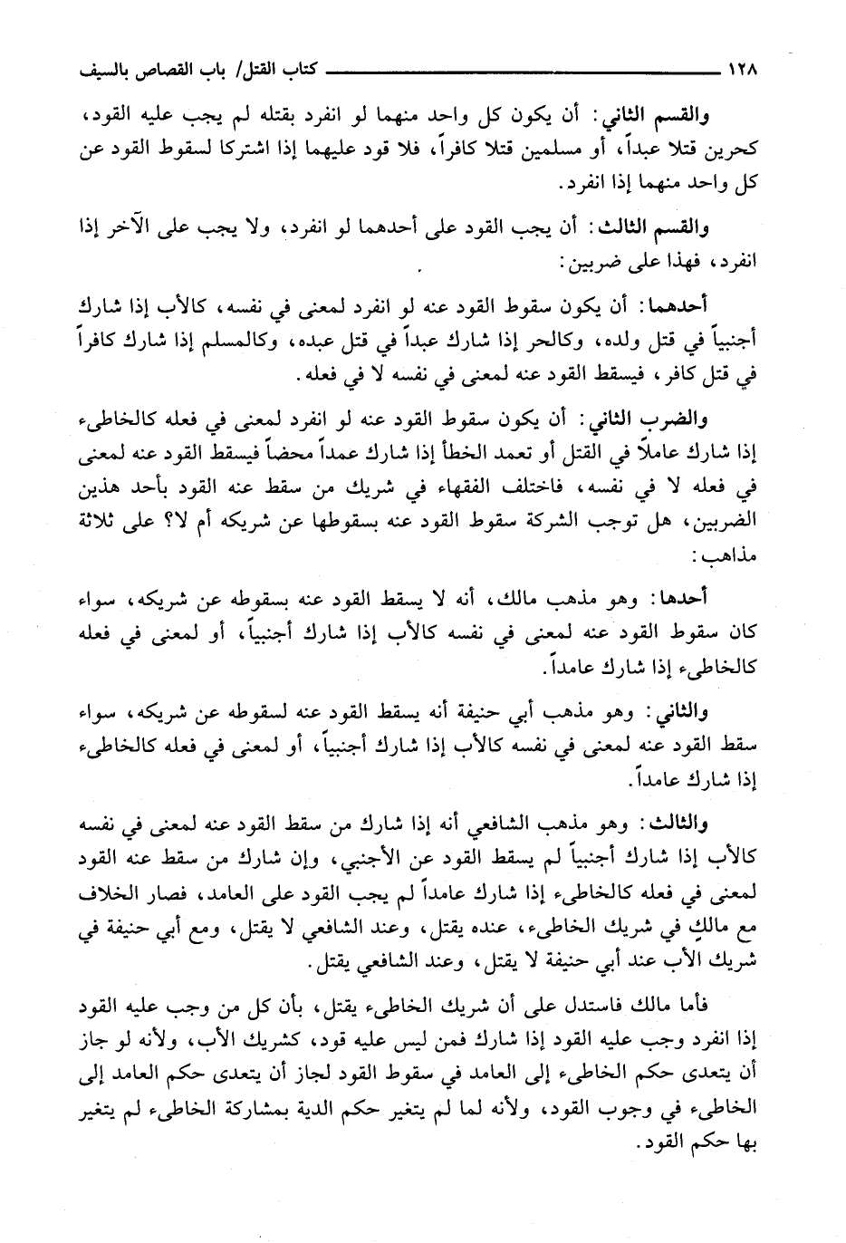 وَالضَّرْبُ الثَّانِي: أَنْ يَكُونَ سُقُوطُ الْقَوَدِ عَنْهُ لَوِ انْفَرَدَ لِمَعْنًى فِي فِعْلِهِ كالخاطئ إذا شارك عاملاً فِي الْقَتْلِ أَوْ تَعَمَّدَ الْخَطَأَ إِذَا شَارَكَ عَمْدًا مَحْضًا فَيَسْقُطُ الْقَوَدُ عَنْهُ لِمَعْنًى فِي فِعْلِهِ لَا فِي نَفْسِهِ، فَاخْتَلَفَ الْفُقَهَاءُ فِي شَرِيكِ مَنْ سَقَطَ عَنْهُ الْقَوَدُ بِأَحَدِ هَذَيْنِ الضَّرْبَيْنِ، هَلْ تُوجِبُ الشَّرِكَةُ سُقُوطَ الْقَوَدِ عَنْهُ بِسُقُوطِهَا عَنْ شَرِيكِهِ أَمْ لَا؟ عَلَى ثَلَاثَةِ مَذَاهِبَ: