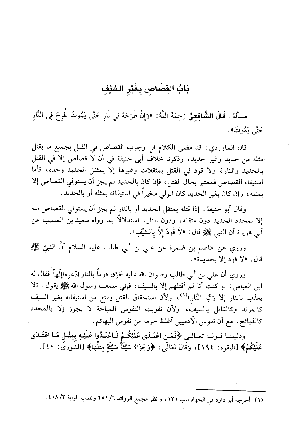 قَالَ الْمَاوَرْدِيُّ: قَدْ مَضَى الْكَلَامُ فِي وُجُوبِ الْقِصَاصِ فِي الْقَتْلِ بِجَمِيعِ مَا يَقْتُلُ مِثْلُهُ مِنْ حَدِيدٍ وَغَيْرِ حَدِيدٍ، وَذَكَرْنَا خِلَافَ أَبِي حَنِيفَةَ فِي أَنْ لَا قِصَاصَ إِلَّا فِي الْقَتْلِ بِالْحَدِيدِ وَالنَّارِ، وَلَا قَوَدَ فِي الْقَتْلِ، بِمُثَقَّلَاتٍ وَغَيْرِهَا إِلَّا بِمُثَقَّلِ الْحَدِيدِ وَحْدَهُ، فَأَمَّا اسْتِيفَاءُ الْقِصَاصِ فَمُعْتَبَرٌ بِحَالِ الْقَتْلِ، فَإِنْ كَانَ بِالْحَدِيدِ لَمْ يَجُزْ أَنْ يَسْتَوْفِيَ الْقِصَاصَ إِلَّا بِمِثْلِهِ، وَإِنْ كَانَ بِغَيْرِ الْحَدِيدِ كَانَ الْوَلِيُّ مُخَيَّرًا فِي اسْتِيفَائِهِ بِمِثْلِهِ أَوْ بِالْحَدِيدِ.