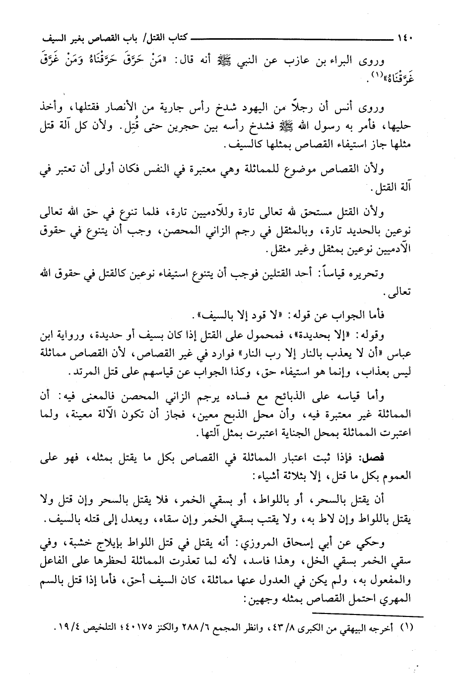وَقَوْلُهُ: " إِلَّا بِحَدِيدَةٍ "، فَمَحْمُولٌ عَلَى الْقَتْلِ إذا كان بسيف أو حديدة، ورواية ابْنِ عَبَّاسٍ " أَنْ لَا يُعَذِّبَ بِالنَّارِ إِلَّا رَبُّ النَّارِ " فَوَارِدٌ فِي غَيْرِ الْقِصَاصِ، لِأَنَّ القصاص مماثلة ليس بعذاب، وَإِنَّمَا هُوَ اسْتِيفَاءُ حَقٍّ، وَكَذَا الْجَوَابُ عَنْ قِيَاسِهِمْ عَلَى قَتْلِ الْمُرْتَدِّ.