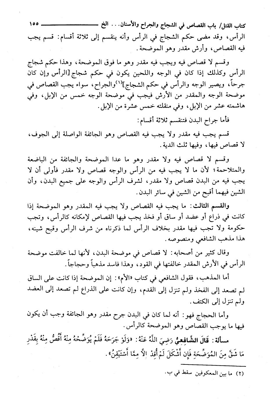 وَالْقِسْمُ الثَّالِثُ: مَا يَجِبُ فِيهِ الْقِصَاصُ وَلَا يَجِبُ فِيهِ الْمُقَدَّرُ وَهُوَ الْمُوضِحَةُ إِذَا كَانَتْ فِي ذِرَاعٍ أَوْ عَضُدٍ أَوْ سَاقٍ أَوْ فَخِذٍ يَجِبُ فِيهَا الْقِصَاصُ لِإِمْكَانِهِ كَالرَّأْسِ، وَتَجِبُ حُكُومَةٌ وَلَا تَجِبُ فِيهَا مُقَدَّرٌ بِخِلَافِ الرَّأْسِ لِمَا ذَكَرْنَاهُ مِنْ شَرَفِ الرَّأْسِ وَقُبْحِ شَيْنِهِ، هَذَا مَذْهَبُ الشَّافِعِيِّ وَمَنْصُوصِهِ.