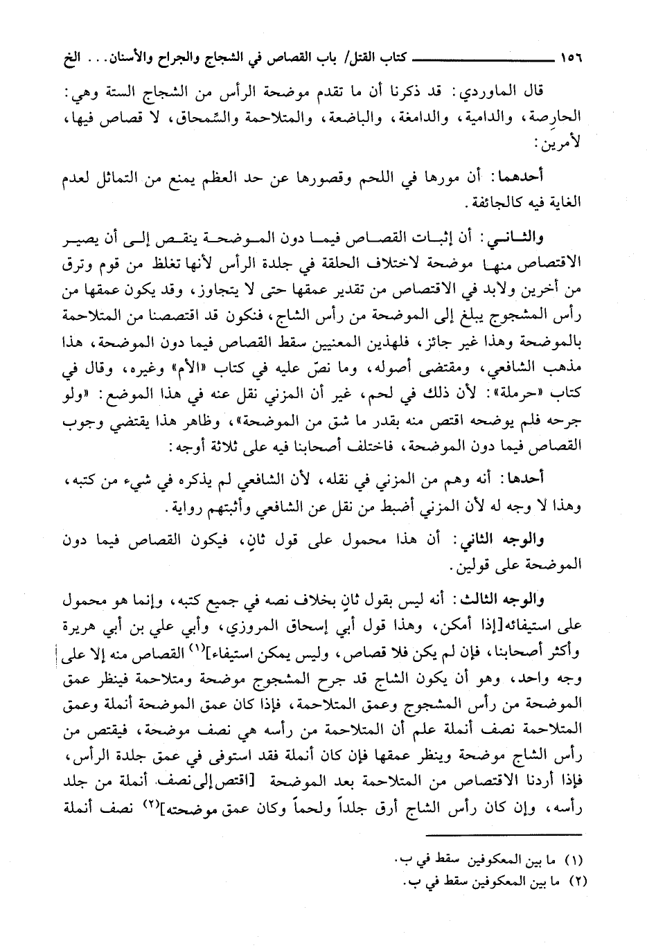 وَالثَّانِي: أَنَّ إِثْبَاتَ الْقِصَاصِ فِيمَا دُونَ الْمُوضِحَةِ يَنْقُصُ إِلَى أَنْ يَصِيرَ الِاقْتِصَاصُ مِنْهَا مُوضِحَةً لِاخْتِلَافِ الْحَلْقَةِ فِي جِلْدَةِ الرَّأْسِ لِأَنَّهَا تَغْلُظُ مِنْ قَوْمٍ وَتَرِقُّ مِنْ آخَرِينَ وَلَا بُدَّ فِي الِاقْتِصَاصِ مِنْ تَقْدِيرِ عُمْقِهَا حَتَّى لَا يَتَجَاوَزَ، وَقَدْ يَكُونُ عُمْقُهَا مِنْ رَأْسِ الْمَشْجُوجِ يَبْلُغُ إِلَى الْمُوضِحَةِ مِنْ رَأْسِ الشَّاجِّ، فَنَكُونُ قَدِ اقْتَصَصْنَا مِنَ المُتَلَاحِمَةِ بِالْمُوضِحَةِ وَهَذَا غَيْرُ جَائِزٍ، فَلِهَذَيْنِ الْمَعْنَيَيْنِ سَقَطَ الْقِصَاصُ فِيمَا دُونَ الْمُوضِحَةِ، هَذَا مَذْهَبُ الشَّافِعِيِّ، وَمُقْتَضَى أُصُولِهِ، وَمَا نَصَّ عَلَيْهِ فِي كِتَابِ " الْأُمِّ " وَغَيْرِهِ، وَقَالَ فِي كِتَابِ " حَرْمَلَةَ ": لِأَنَّ ذَلِكَ فِي لَحْمٍ، غَيْرَ أَنَّ الْمُزَنِيَّ نَقَلَ عَنْهُ فِي هَذَا الْمَوْضِعِ: " وَلَوْ جَرَحَهُ فَلَمْ يُوضِحْهُ اقْتُصَّ مِنْهُ بِقَدْرِ مَا شَقَّ مِنَ المُوضِحَةِ "، وَظَاهِرُ هَذَا يَقْتَضِي وُجُوبَ الْقِصَاصِ فِيمَا دُونَ الْمُوضِحَةِ، فَاخْتَلَفَ أَصْحَابُنَا فِيهِ عَلَى ثَلَاثَةِ أَوْجُهٍ: