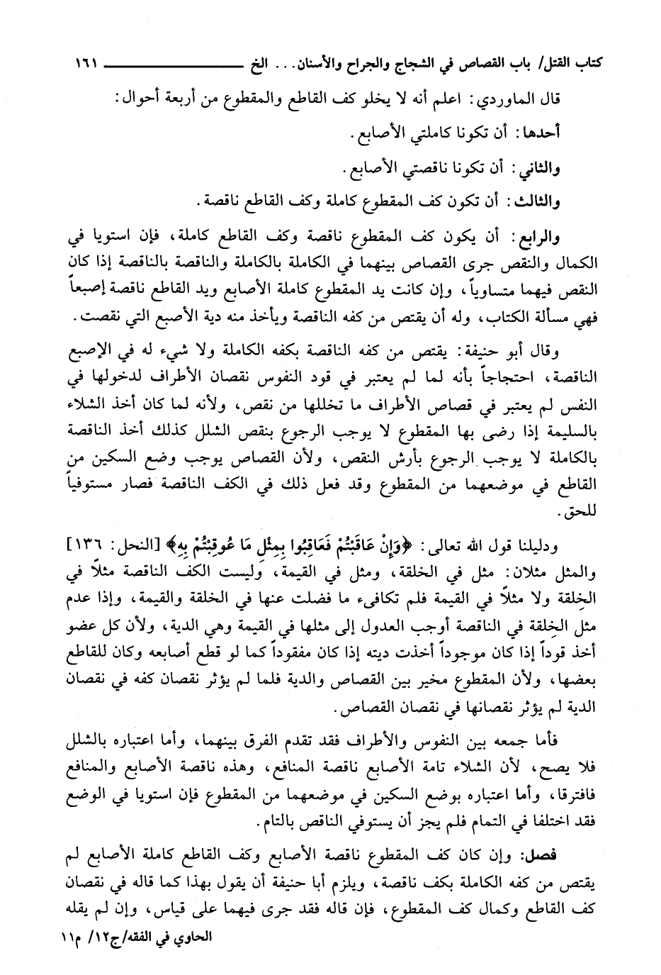 وَدَلِيلُنَا قَوْلُ اللَّهِ تَعَالَى: {وَإِنْ عَاقَبْتُمْ فَعَاقِبُوا بِمِثْلِ مَا عُوقِبْتُمْ بِهِ} [النحل: 136] وَالْمِثْلُ مِثْلَانِ: مِثْلٌ فِي الْخِلْقَةِ، وَمِثْلٌ فِي الْقِيمَةِ، وَلَيْسَتِ الْكَفُّ النَّاقِصَةُ مِثْلًا فِي الْخِلْقَةِ وَلَا مِثْلًا فِي الْقِيمَةِ فَلَمْ تُكَافِئْ مَا فُضِّلَتْ عَنْهَا فِي الْخِلْقَةِ وَالْقِيمَةِ، وَإِذَا عُدِمَ مِثْلُ الْخِلْقَةِ فِي النَّاقِصَةِ أَوْجَبَ الْعُدُولَ إِلَى مِثْلِهَا فِي الْقِيمَةِ وَهِيَ الدِّيَةُ، وَلِأَنَّ كُلَّ عُضْوٍ أُخِذَ قَوَدًا إِذَا كَانَ مَوْجُودًا أُخِذَتْ دِيَتُهُ إِذَا كَانَ مَفْقُودًا كَمَا لَوْ قُطِعَ أَصَابِعُهُ وَكَانَ لِلْقَاطِعِ بَعْضُهَا، وَلِأَنَّ الْمَقْطُوعَ مُخَيَّرٌ بَيْنَ الْقِصَاصِ وَالدِّيَةِ فَلَمَّا لَمْ يُؤَثِّرْ نُقْصَانُ كَفِّهِ فِي نُقْصَانِ الدِّيَةِ لَمْ يُؤَثِّرْ نُقْصَانُهَا فِي نُقْصَانِ الْقِصَاصِ.