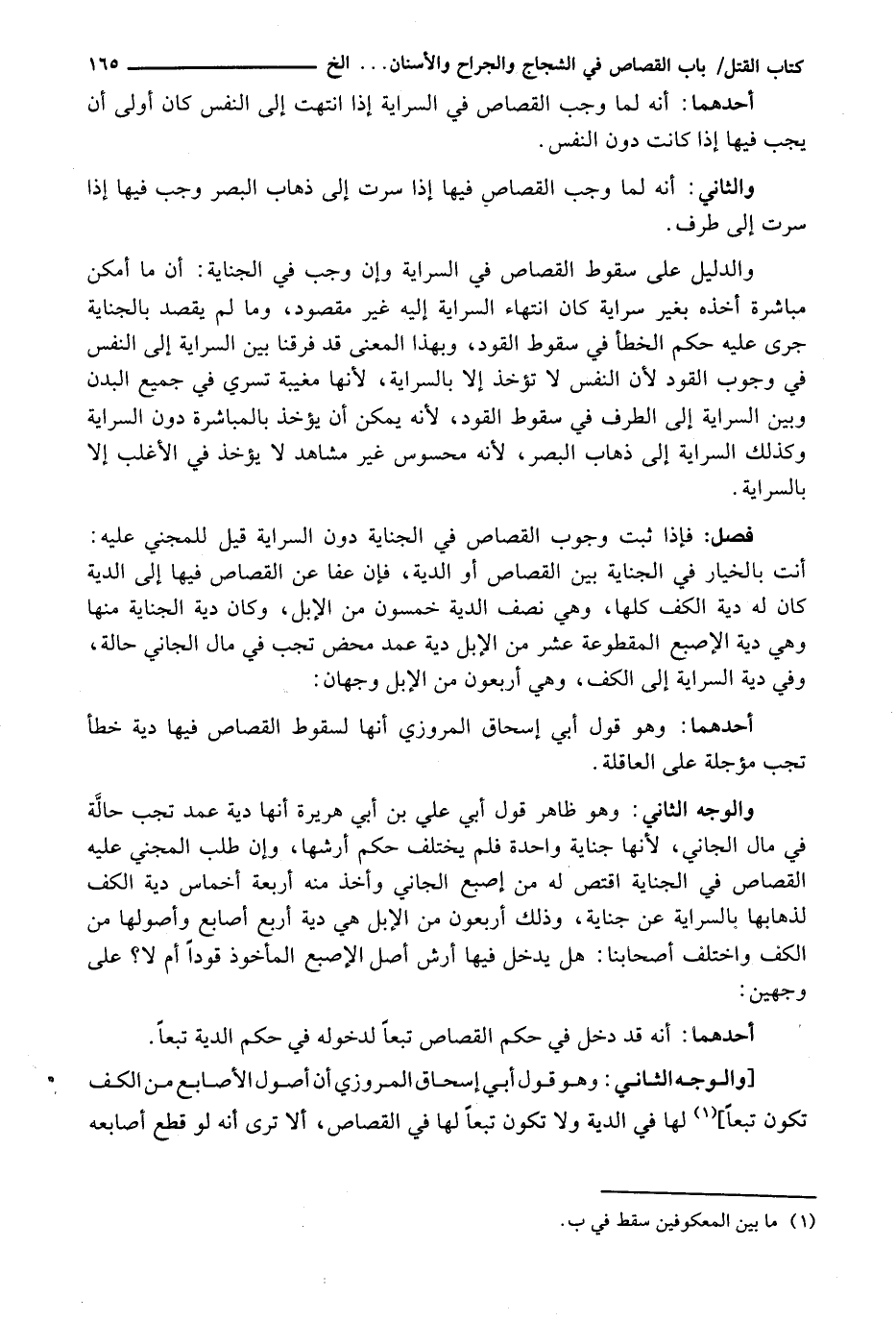 أَحَدُهُمَا: أَنَّهُ قَدْ دَخَلَ فِي حُكْمِ الْقِصَاصِ تَبَعًا لِدُخُولِهِ في حكم الدية تبعاً. [وَالْوَجْهُ الثَّانِي: وَهُوَ قَوْلُ أَبِي إِسْحَاقَ الْمَرْوَزِيِّ إنَّ أُصُولَ الْأَصَابِعِ مِنَ الكَفِّ تَكُونُ تَبَعًا] لَهَا فِي الدِّيَةِ وَلَا تَكُونُ تَبَعًا لَهَا فِي الْقِصَاصِ، أَلَا تَرَى أَنَّهُ لَوْ قَطَعَ أصابعه
