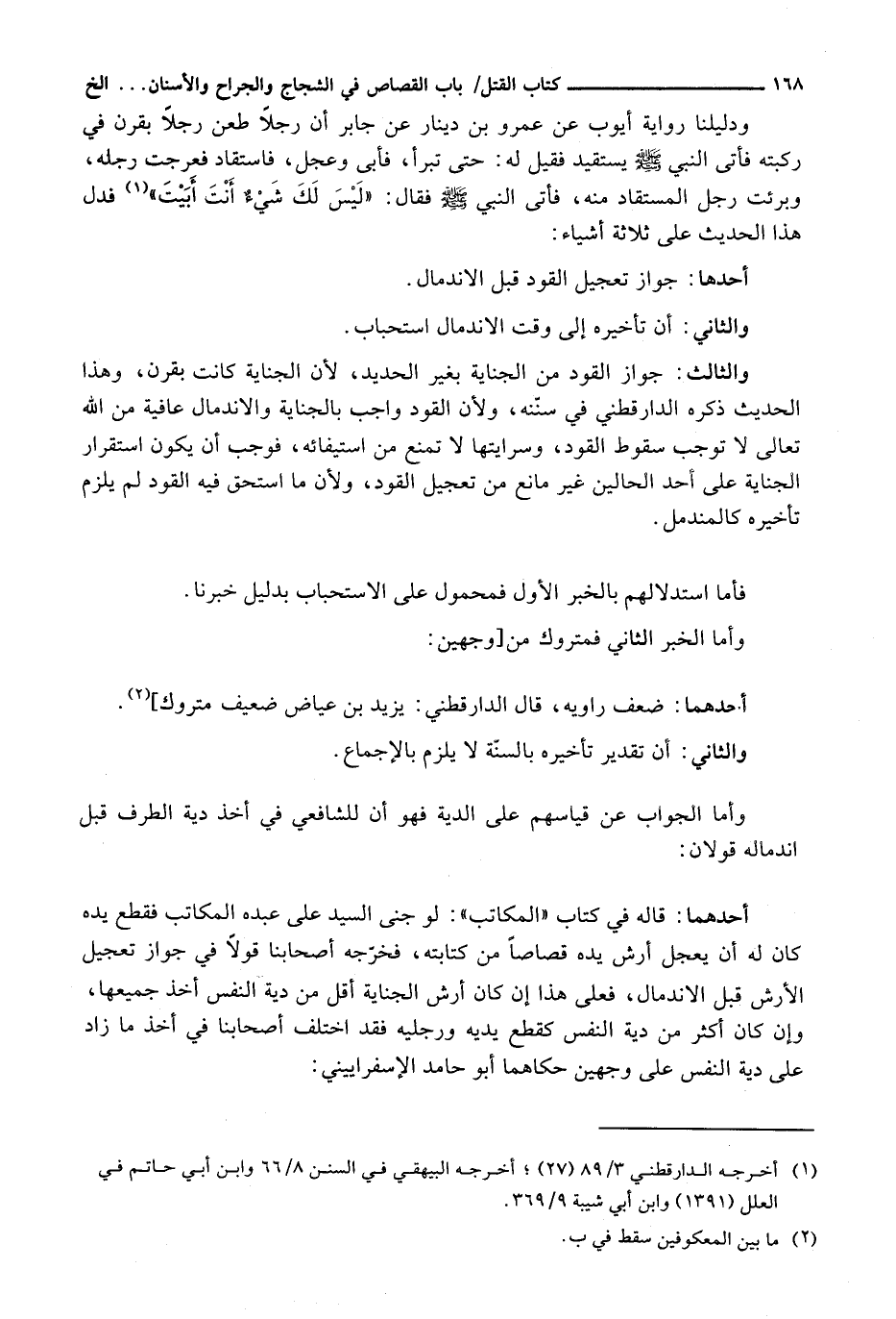 وَالثَّالِثُ: جَوَازُ الْقَوَدِ مِنَ الجِنَايَةِ بِغَيْرِ الْحَدِيدِ، لِأَنَّ الْجِنَايَةَ كَانَتْ بِقَرْنٍ، وَهَذَا الْحَدِيثُ ذَكَرَهُ الدَّارَقُطْنِيُّ فِي سُنَنِهِ، وَلِأَنَّ الْقَوَدَ وَاجِبٌ بِالْجِنَايَةِ وَالِانْدِمَالَ عَافِيَةٌ مِنَ اللَّهِ تَعَالَى لَا تُوجِبُ سُقُوطَ الْقَوَدِ، وَسِرَايَتُهَا لَا تَمْنَعُ مِنِ اسْتِيفَائِهِ، فَوَجَبَ أَنْ يَكُونَ اسْتِقْرَارُ الْجِنَايَةِ عَلَى أَحَدِ الْحَالَيْنِ غَيْرُ مَانِعٍ مِنْ تَعْجِيلِ الْقَوَدِ، وَلِأَنَّ مَا اسْتُحِقَّ فِيهِ الْقَوَدُ لَمْ يَلْزَمْ تَأْخِيرُهُ كَالْمُنْدَمِلِ.