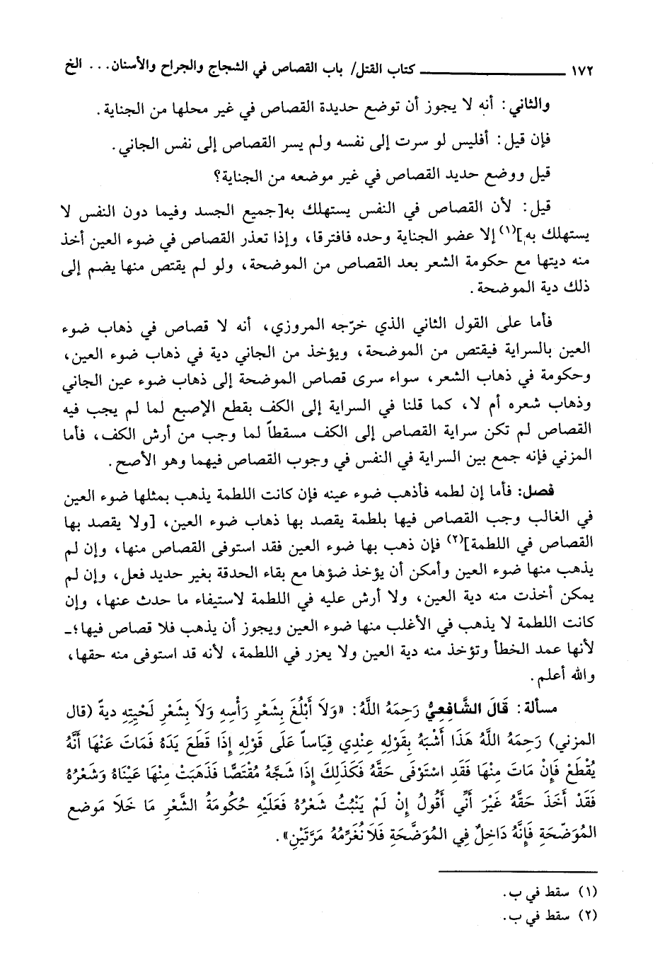 فَأَمَّا عَلَى الْقَوْلِ الثَّانِي الَّذِي خَرَّجَهُ الْمَرْوَزِيُّ، إنَّهُ لَا قِصَاصَ فِي ذَهَابِ ضَوْءِ الْعَيْنِ بِالسِّرَايَةِ فَيُقْتَصُّ مِنَ المُوضِحَةِ، وَيُؤْخَذُ مِنَ الجَانِي دِيَةٌ فِي ذَهَابِ ضَوْءِ الْعَيْنِ، وَحُكُومَةٌ فِي ذَهَابِ الشَّعْرِ، سَوَاءٌ سَرَى قِصَاصُ الْمُوضِحَةِ إِلَى ذَهَابِ ضَوْءِ عَيْنِ الْجَانِي وَذَهَابِ شَعْرِهِ أَمْ لَا، كَمَا قُلْنَا فِي السِّرَايَةِ إِلَى الْكَفِّ بِقَطْعِ الْأصْبع لَمَّا لَمْ يَجِبْ فِيهِ الْقِصَاصُ لَمْ تَكُنْ سِرَايَةُ الْقِصَاصِ إِلَى الْكَفِّ مُسْقِطًا لِمَا وَجَبَ مِنْ أَرْشِ الْكَفِّ، فَأَمَّا الْمُزَنِيُّ فَإِنَّهُ جَمَعَ بَيْنَ السِّرَايَةِ فِي النَّفْسِ فِي وُجُوبِ الْقِصَاصِ فِيهِمَا وَهُوَ الْأَصَحُّ.