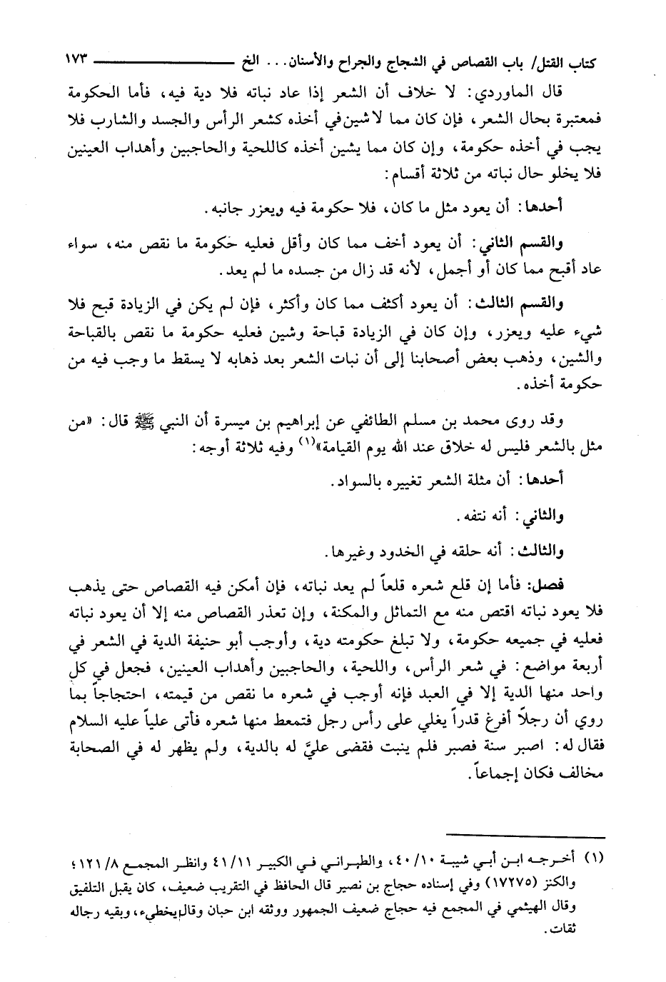 قَالَ الْمَاوَرْدِيُّ: لَا خِلَافَ أَنَّ الشَّعْرَ إِذَا عَادَ نَبَاتُهُ فَلَا دِيَةَ فِيهِ، فَأَمَّا الْحُكُومَةُ فَمُعْتَبَرَةٌ بِحَالِ الشَّعْرِ، فَإِنْ كَانَ مِمَّا لَا شَيْنَ فِي أَخْذِهِ كَشَعْرِ الرَّأْسِ وَالْجَسَدِ وَالشَّارِبِ فَلَا يَجِبُ فِي أَخْذِهِ حُكُومَةٌ، وَإِنْ كَانَ مِمَّا يَشِينُ أَخْذُهُ كَاللِّحْيَةِ وَالْحَاجِبَيْنِ وَأَهْدَابِ الْعَيْنَيْنِ فَلَا يَخْلُو حَالُ نَبَاتِهِ مِنْ ثَلَاثَةِ أَقْسَامٍ:
