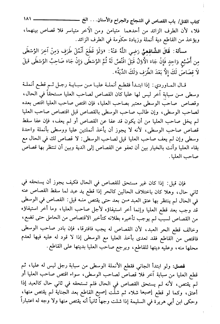 قَالَ الْمَاوَرْدِيُّ: إِذَا ابْتَدَأَ فَقَطَعَ أَنْمُلَةً عُلْيَا من سباية رجل ثم قطع أنملة وسطى من سبابة آخر ليس لها عليا كان القصاص لصاحب العليا مستحقا في الحال، وقصاص صاحب الْوُسْطَى مُعْتبر بِصَاحِبِ الْعُلْيَا، فَإِنِ اقْتَصَّ صَاحِبُ الْعُلْيَا اقْتُصَّ بَعْدَهُ لِصَاحِبِ الْوُسْطَى، وَإِنْ طَالَبَ صَاحِبُ الْوُسْطَى بِالْقِصَاصِ قَبْلَ اقْتِصَاصِ صَاحِبِ الْعُلْيَا لَمْ يَخْلُ صَاحِبُ الْعُلْيَا مِنْ أَنْ يَكُونَ قَدْ عَفَا عَنِ الْقِصَاصِ أَوْ لَمْ يَعْفُ، فَإِنْ عَفَا سَقَطَ قِصَاصُ صَاحِبِ الْوُسْطَى، لِأَنَّهُ لَا يَجُوزُ أَنْ يَأْخُذَ أَنَمُلَتَيْنِ عُلْيَا وَوُسْطَى بِأَنْمُلَةٍ وَاحِدَةٍ وُسْطَى وَإِنْ لَمْ يَعْفُ صَاحِبُ الْعُلْيَا قِيلَ لِصَاحِبِ الْوُسْطَى: لَا قِصَاصَ لَكَ فِي الْحَالِ مَعَ بَقَاءِ الْعُلْيَا وَأَنْتَ بِالْخِيَارِ بَيْنَ أَنْ تَعْفُوَ عَنِ الْقِصَاصِ إِلَى الدِّيَةِ وَبَيْنَ أَنْ تَنْتَظِرَ بِهَا قِصَاصَ صَاحِبِ الْعُلْيَا.