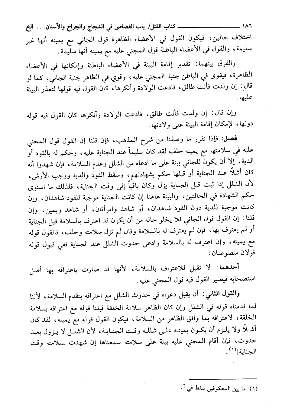 فَإِذَا تَقَرَّرَ مَا وَصَفْنَا مِنْ شَرْحِ الْمَذْهَبِ، فَإِنْ قُلْنَا إِنَّ الْقَوْلَ قَوْلُ الْمَجْنِيِّ عَلَيْهِ فِي سَلَامَتِهَا مَعَ يَمِينِهِ حَلَفَ لَقَدْ كَانَ سَلِيمًا عِنْدَ الْجِنَايَةِ عَلَيْهِ، وَحُكِمَ لَهُ بِالْقَوَدِ أَوِ الدِّيَةِ، إِلَّا أَنْ يَكُونَ لِلْجَانِي بَيِّنَةٌ عَلَى مَا ادَّعَاهُ مِنَ الشَّلَلِ وَعَدَمِ السلامة، فإن شهدوا أنه كان أشلا عِنْدَ الْجِنَايَةِ أَوْ قَبْلَهَا حُكِمَ بِشَهَادَتِهِمْ، وَسَقَطَ الْقَوَدُ وَالدِّيَةُ وَوَجَبَ الْأَرْشُ، لِأَنَّ الشَّلَلَ إِذَا ثبت قبل الجناية يَزُل وَكَانَ بَاقِيًا إِلَى وَقْتِ الْجِنَايَةِ، فَلِذَلِكَ مَا اسْتَوَى حُكْمُ الشَّهَادَةِ فِي الْحَالَتَيْنِ، وَالْبَيِّنَةُ هَاهُنَا إِنْ كَانَتِ الْجِنَايَةُ مُوجِبَةً لِلْقَوَدِ شَاهِدَانِ، وَإِنْ كَانَتْ مُوجِبَةً لِلدِّيَةِ دُونَ الْقَوَدِ شَاهِدَانِ، أَوْ شَاهِدٌ وَامْرَأَتَانِ، أَوْ شَاهِدٌ وَيَمِينٌ، وَإِنْ قُلْنَا: إِنَّ الْقَوْلَ قَوْلُ الْجَانِي فَلَا يَخْلُو حَالُهُ مِنْ أَنْ يَكُونَ قَدِ اعْتَرَفَ بِالسَّلَامَةِ قَبْلَ الْجِنَايَةِ أَوْ لَمْ يَعْتَرِفْ بِهَا، فَإِنْ لَمْ يَعْتَرِفْ لَهُ بِالسَّلَامَةِ وَقَالَ لَمْ تَزُلْ سَلَامَتُهُ وَحَلَفَ، فَالْقَوْلُ قَوْلُهُ مَعَ يَمِينِهِ، وَإِنِ اعْتَرَفَ لَهُ بِالسَّلَامَةِ وَادَّعَى حُدُوثَ الشَّلَلِ عِنْدَ الْجِنَايَةِ فَفِي قَبُولِ قَوْلِهِ قَوْلَانِ مَنْصُوصَانِ: