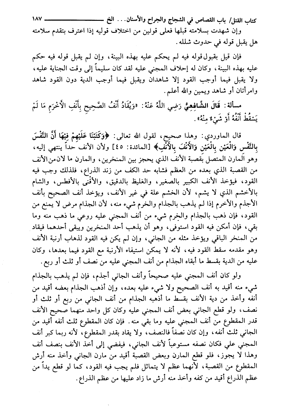 قَالَ الْمَاوَرْدِيُّ: وَهَذَا صَحِيحٌ، لِقَوْلِ اللَّهِ تَعَالَى: {وَكَتَبْنَا عَلَيْهِمْ فِيهَا أَنَّ النَّفْسَ بِالنَّفْسِ وَالْعَيْنَ بِالْعَيْنِ وَالأَنْفَ بالأنف} [المائدة: 45] ولأن الأنف حدا يُنْتَهَى إِلَيْهِ، وَهُوَ الْمَارِنُ الْمُتَّصِلُ بِقَصَبَةِ الْأَنْفِ الَّذِي يَحْجِزُ بَيْنَ الْمِنْخَرَيْنِ، وَالْمَارِنُ مَا لَانَ مِنَ الأَنْفِ مِنَ القَصَبَةِ الَّذِي بَعْدَهُ مِنَ العَظْمِ فَشَابَهَ حَدَّ الْكَفِّ مِنْ زَنْدِ الذِّرَاعِ، فَلِذَلِكَ وَجَبَ فِيهِ الْقَوَدُ، فَيُؤْخَذُ الْأَنْفُ الْكَبِيرُ بِالصَّغِيرِ، وَالْغَلِيظُ بِالدَّقِيقِ، وَالْأَقْنَى بِالْأَفْطَسِ، وَالشَّامِّ بِالْأَخْشَمِ الَّذِي لَا يَشُمُّ، لِأَنَّ الْخَشْمَ عِلَّةٌ فِي غَيْرِ الْأَنْفِ، وَيُؤْخَذُ أَنْفُ الصَّحِيحِ بِأَنْفِ الْأَجْذَمِ وَالْأَخْرَمِ إِذَا لَمْ يَذْهَبْ بِالْجُذَامِ وَالْخَرْمِ شَيْءٌ مِنْهُ، لِأَنَّ الْجُذَامَ مَرَضٌ لَا يَمْنَعُ مِنَ القَوَدِ، فَإِنْ ذَهَبَ بِالْجُذَامِ وَالْخَرْمِ شَيْءٌ مِنْ أَنْفِ الْمَجْنِيِّ عَلَيْهِ رُوعِيَ مَا ذَهَبَ مِنْهُ وَمَا بَقِيَ، فَإِنْ أَمْكَنَ فِيهِ الْقَوَدُ اسْتُوفِيَ، وَهُوَ أَنْ يَذْهَبَ أَحَدُ الْمِنْخَرَيْنِ وَيَبْقَى أَحَدُهُمَا فَيُقَادُ مِنَ المِنْخَرِ الْبَاقِي وَيُؤْخَذُ مِثْلُهُ مِنَ الجَانِي، وَإِنْ لَمْ يَكُنْ فِيهِ الْقَوَدُ لِذَهَابِ أَرْنَبَةِ الْأَنْفِ وَهُوَ مُقَدَّمُهُ سَقَطَ الْقَوَدُ فِيهِ، لِأَنَّهُ لَا يُمْكِنُ اسْتِيفَاءُ الْأَرْنَبَةِ مَعَ الْقَوَدِ فِيمَا بَعْدَهَا، وَكَانَ عَلَيْهِ مِنَ الدِّيَةِ بِقِسْطِ مَا أَبْقَاهُ الْجُذَامُ مِنْ أَنْفِ الْمَجْنِيِّ عَلَيْهِ مِنْ نِصْفٍ أَوْ ثُلْثٍ أَوْ رُبْعٍ.