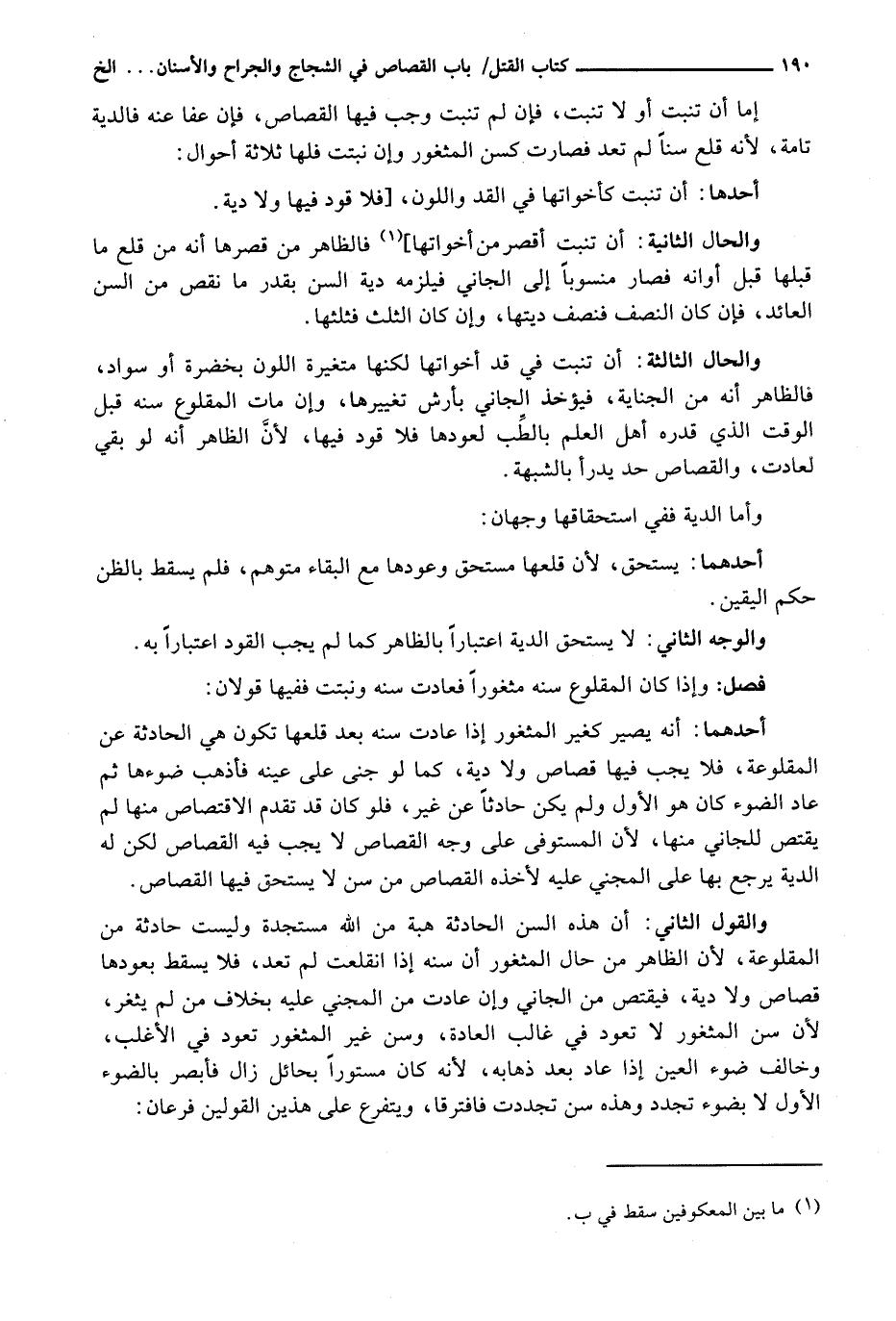وَالْقَوْلُ الثَّانِي: إنَّ هَذِهِ السِّنَّ الْحَادِثَةَ هِبَةٌ مِنَ اللَّهِ مُسْتَجَدَّةٌ وَلَيْسَتْ حَادِثَةً مِنَ المَقْلُوعَةِ، لِأَنَّ الظَّاهِرَ مِنْ حَالِ الْمَثْغُورِ أَنَّ سِنَّهُ إِذَا انْقَلَعَتْ لَمْ تَعُدْ، فَلَا يَسْقُطُ بِعَوْدِهَا قِصَاصٌ وَلَا دِيَةٌ، فَيُقْتَصُّ مِنَ الجَانِي وَإِنْ عَادَتْ مِنَ المَجْنِيِّ عَلَيْهِ بِخِلَافِ مَنْ لَمْ يَثْغَرْ، لِأَنَّ سِنَّ الْمَثْغُورِ لَا تَعُودُ فِي غَالِبِ الْعَادَةِ، وَسنَّ غَيْرِ الْمَثْغُورِ تَعُودُ فِي الْأَغْلَبِ، وَخَالَفَ ضَوْءَ الْعَيْنِ إِذَا عَادَ بَعْدَ ذَهَابِهِ، لِأَنَّهُ كَانَ مَسْتُورًا بِحَائِلٍ زَالَ فَأَبْصَرَ بِالضَّوْءِ الْأَوَّلِ لَا بِضَوْءٍ تَجَدَّدَ وَهَذِهِ سِنٌّ تَجَدَّدَتْ فَافْتَرَقَا، وَيَتَفَرَّعُ عَلَى هَذَيْنِ الْقَوْلَيْنِ فَرْعَانِ: