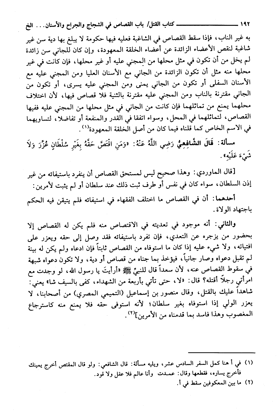 [قَالَ الْمَاوَرْدِيُّ: وَهَذَا صَحِيحٌ لَيْسَ لِمُسْتَحِقِّ الْقِصَاصِ أَنْ يَنْفَرِدَ بِاسْتِيفَائِهِ مِنْ غَيْرِ إِذْنِ السُّلْطَانِ، سَوَاءٌ كَانَ فِي نَفْسٍ أَوْ طَرَفٍ ثَبَتَ ذَلِكَ عِنْدَ سُلْطَانٍ أَوْ لَمْ يَثْبُتْ لِأَمْرَيْنِ: