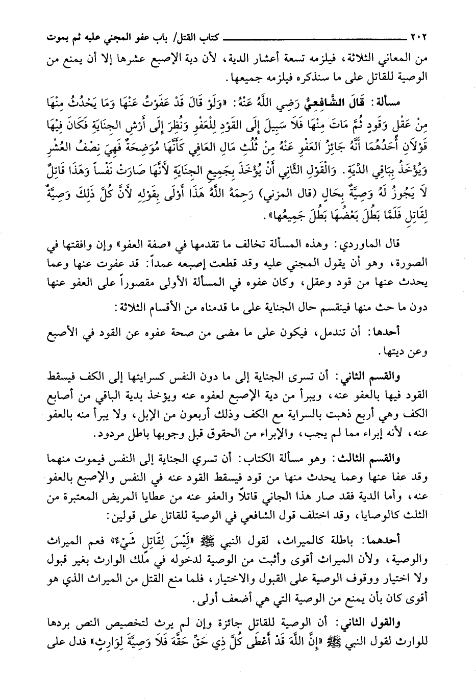 قَالَ الْمَاوَرْدِيُّ: وَهَذِهِ الْمَسْأَلَةُ تُخَالِفُ مَا تَقَدَّمَهَا فِي " صِفَةِ الْعَفْوِ " وَإِنْ وَافَقَتْهَا فِي الصُّورَةِ، وَهُوَ أَنْ يَقُولَ الْمَجْنِيُّ عَلَيْهِ وَقَدْ قُطِعَتْ أُصْبُعهُ عَمْدًا: قَدْ عَفَوْتُ عَنْهَا وَعَمَّا يَحْدُثُ عَنْهَا مِنْ قَوَدٍ وَعَقْلٍ، وَكَانَ عَفْوُهُ فِي الْمَسْأَلَةِ الْأُولَى مَقْصُورًا عَلَى الْعَفْوِ عَنْهَا دُونَ ما حث مِنْهَا فَيَنْقَسِمُ حَالُ الْجِنَايَةِ عَلَى مَا قَدَّمْنَاهُ مِنَ الْأَقْسَامِ الثَّلَاثَةِ: