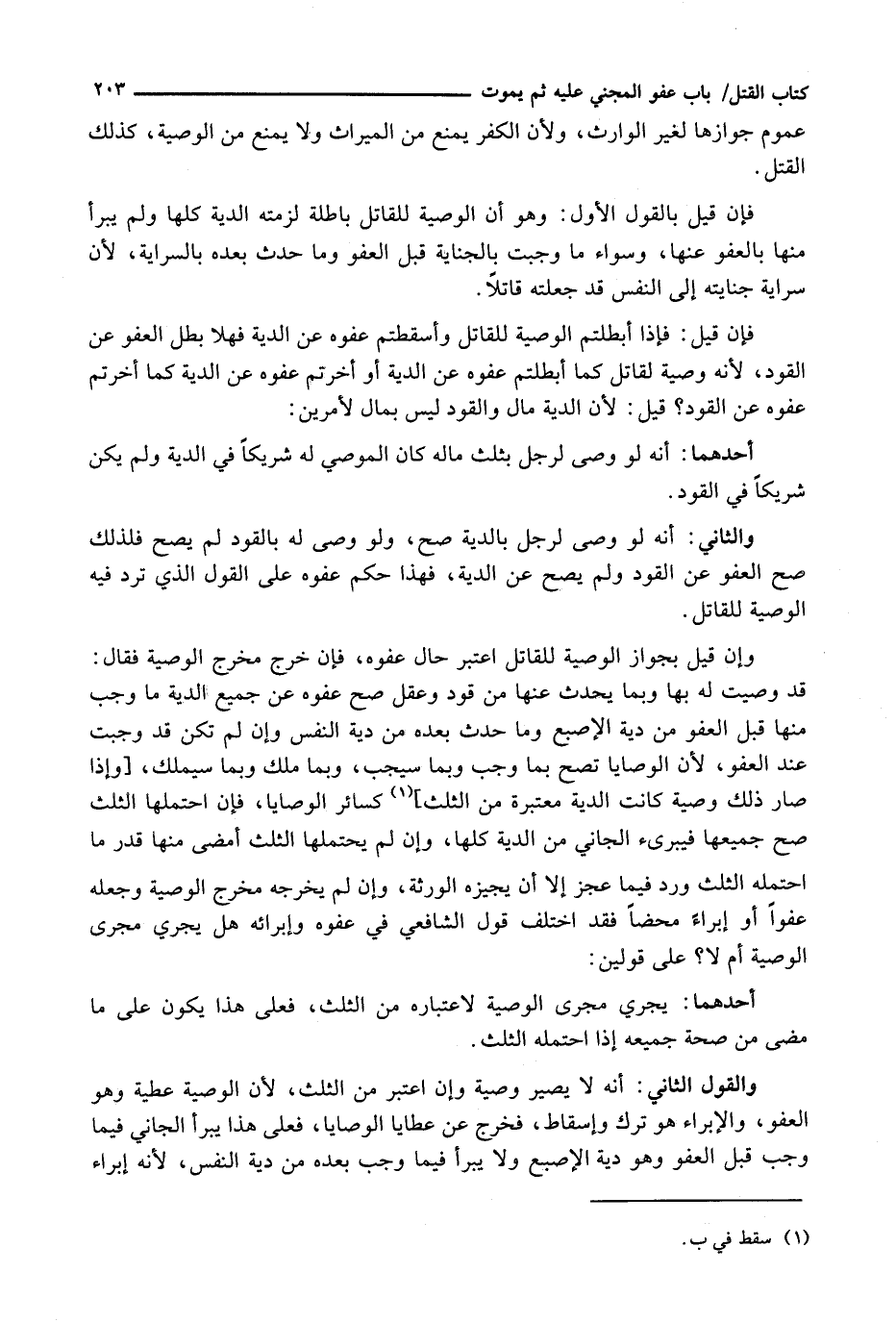 وَالْقَوْلُ الثَّانِي: إنَّهُ لَا يَصِيرُ وَصِيَّةً وَإِنِ اعْتُبِرَ مِنَ الثُّلُثِ، لِأَنَّ الْوَصِيَّةَ عَطِيَّةٌ وَهُوَ الْعَفْوُ، وَالْإِبْرَاءُ هُوَ تَرْكٌ وَإِسْقَاطٌ، فَخَرَجَ عَنْ عَطَايَا الْوَصَايَا، فَعَلَى هَذَا يَبْرَأُ الْجَانِي فِيمَا وَجَبَ قَبْلَ الْعَفْوِ وَهُوَ دِيَةُ الْأُصْبُع وَلَا يَبْرَأُ فِيمَا وَجَبَ بَعْدَهُ مِنْ دِيَةِ النَّفْسِ، لِأَنَّهُ إِبْرَاءٌ