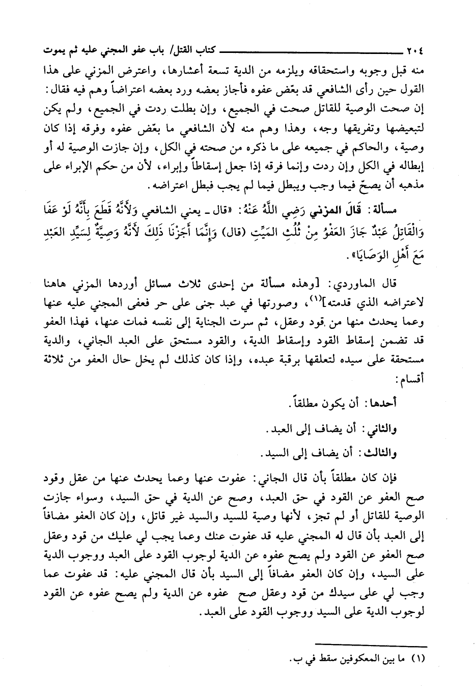 قَالَ الْمَاوَرْدِيُّ: [وَهَذِهِ مَسْأَلَةٌ مِنْ إِحْدَى ثَلَاثِ مَسَائِلَ أَوْرَدَهَا الْمُزَنِيُّ هَاهُنَا لِاعْتِرَاضِهِ الَّذِي قَدَّمْتُهُ] ، وصورتها في عبد جنى على حر فعفى الْمَجْنِيُّ عَلَيْهِ عَنْهَا وَعَمَّا يَحْدُثُ مِنْهَا مِنْ قَوَدٍ وَعَقْلٍ، ثُمَّ سَرَتِ الْجِنَايَةُ إِلَى نَفْسِهِ فَمَاتَ عَنْهَا، فَهَذَا الْعَفْوُ قَدْ تَضَمَّنَ إِسْقَاطَ الْقَوَدِ وَإِسْقَاطَ الدِّيَةِ، وَالْقَوَدُ مُسْتَحَقٌّ عَلَى الْعَبْدِ الْجَانِي، وَالدِّيَةُ مُسْتَحَقَّةٌ عَلَى سَيِّدِهِ لِتَعَلُّقِهَا بِرَقَبَةِ عَبْدِهِ، وَإِذَا كَانَ كَذَلِكَ لَمْ يَخْلُ حَالُ الْعَفْوِ مِنْ ثَلَاثَةِ أَقْسَامٍ: