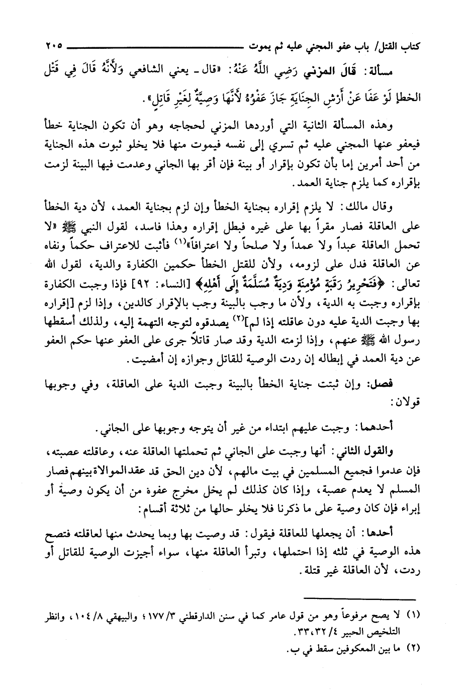 قال المزني رضي الله عنه: " قال - يعني الشافعي ولأنه قال فِي قَتْلِ الْخَطَأِ لَوْ عَفَا عَنْ أَرْشِ الْجِنَايَةِ جَازَ عَفْوُهُ لَأنَهَا وَصِيَّةٌ لِغَيْرِ قَاتِلٍ ".