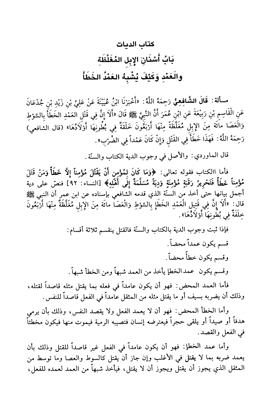 فَأَمَّا الْكِتَابُ فَقَوْلُهُ تَعَالَى: {وَمَا كَانَ لِمُؤْمِنٍ أَنْ يَقْتُلَ مُؤْمِنًا إِلا خَطَأً وَمَنْ قَتَلَ مُؤْمِنًا خَطَأً فَتَحْرِيرُ رَقَبَةٍ مُؤْمِنَةٍ وَدِيَةٌ مُسَلَّمَةٌ إِلَى أَهْلِهِ} [النساء: 92] فَنَصَّ عَلَى دِيَةٍ أَجْمَلَ بَيَانَهَا حَتَّى أَخَذَ مِنَ السُّنَّةِ الَّذِي قَدَّمَهُ الشَّافِعِيُّ بِإِسْنَادِهِ عَنِ ابْنِ عُمَرَ أَنَّ النَّبِيَّ - صَلَّى اللَّهُ عَلَيْهِ وَسَلَّم َ - قَالَ: " أَلَا إِنَّ فِي قَتِيلِ الْعَمْدِ الْخَطَأِ بالسوط والعصا مائة من الإبل مغلظة منها أَرْبَعُونَ خَلِفَةً فِي بُطُونِهَا أَوْلَادُهَا ".