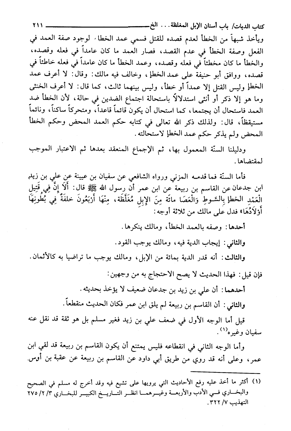فَأَمَّا السُّنَّةُ فَمَا قَدَّمَهُ الْمُزَنِيُّ وَرَوَاهُ الشَّافِعِيُّ عَنْ سُفْيَانَ بْنِ عُيَيْنَةَ عَنْ عَلِيِّ بْنِ زيد ابن جُدْعَانَ عَنِ الْقَاسِمِ بْنِ رَبِيعَةَ عَنِ ابْنِ عُمَرَ أَنَّ رَسُولَ اللَّهِ - صَلَّى اللَّهُ عَلَيْهِ وَسَلَّم َ - قَالَ: أَلَا إِنَّ فِي قَتِيلِ الْعَمْدِ الْخَطَأِ بالسوط والعصا مائة من الإبل مغلظة، منها أَرْبَعُونَ خَلِفَةً فِي بُطُونِهَا أَوْلَادُهَا " فَدَلَّ عَلَى مَالِكٍ مِنْ ثَلَاثَةِ أَوْجُهٍ: