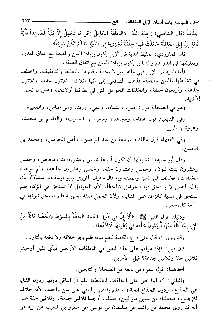 فَأَمَّا الدِّيَةُ مِنَ الْإِبِلِ فَهِيَ مِائَةُ بَعِيرٍ لَا يَخْتَلِفُ قَدْرُهَا بِالتَّغْلِيظِ وَالتَّخْفِيفِ، وَاخْتُلِفَ فِي تَغْلِيظِهَا بِالسِّنِّ وَالصِّفَةِ فَذَهَبَ الشَّافِعِيُّ إلى أنها أثلاث: ثَلَاثُونَ حِقَّةً، وَثَلَاثُونَ جَذَعَةً، وَأَرْبَعُونَ خَلِفَةً، وَالْخَلِفَاتُ الْحَوَامِلُ الَّتِي فِي بُطُونِهَا أَوْلَادُهَا، وَهَلْ مَا تَحْمِلُ إِلَّا ثَنِيَّةً.