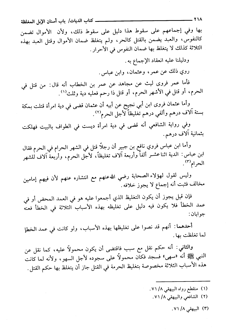 بِهَا وَفِي إِجْمَاعِهِمْ عَلَى سُقُوطِ هَذَا دَلِيلٌ عَلَى سُقُوطِ ذَلِكَ، وَلِأَنَّ الْأَمْوَالَ تُضْمَنُ كَالنُّفُوسِ، وَالْعَبْدَ يُضْمَنُ بِالْقَتْلِ كَالْحُرِّ، وَلَمْ يَتَغَلَّظْ ضَمَانُ الْأَمْوَالِ وَقَتْلُ الْعَبْدِ بِهَذِهِ الثَّلَاثَةِ كَذَلِكَ لَا يَتَغَلَّظُ بِهَا ضَمَانُ النُّفُوسِ فِي الْأَحْرَارِ.