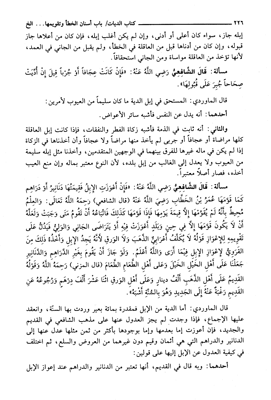 قَالَ الْمَاوَرْدِيُّ: أَمَّا الدِّيَةُ مِنَ الْإِبِلِ فَمُقَدَّرَةٌ بِمِائَةِ بَعِيرٍ وَرَدَتْ بِهَا السُّنَّةُ، وَانْعَقَدَ عَلَيْهَا الْإِجْمَاعُ، فَإِذَا وُجِدَتْ لَمْ يَجُزِ الْعُدُولُ عَنْهَا عَلَى مَذْهَبِ الشَّافِعِيِّ فِي الْقَدِيمِ وَالْجَدِيدِ، فَإِنْ أَعْوَزَتْ إِمَّا بِعَدَمِهَا وَإِمَّا بِوُجُودِهَا بِأَكْثَرَ مِنْ ثَمَنِ مِثْلِهَا عُدِلَ عَنْهَا إِلَى الدَّنَانِيرِ وَالدَّرَاهِمِ الَّتِي هِيَ أَثْمَانٌ وَقِيَمٌ دُونَ غَيْرِهِمَا مِنَ الْعُرُوضِ وَالسِّلَعِ، ثُمَّ اخْتُلِفَ فِي كَيْفِيَّةِ الْعُدُولِ عَنِ الْإِبِلِ إِلَيْهَا عَلَى قَوْلَيْنِ: