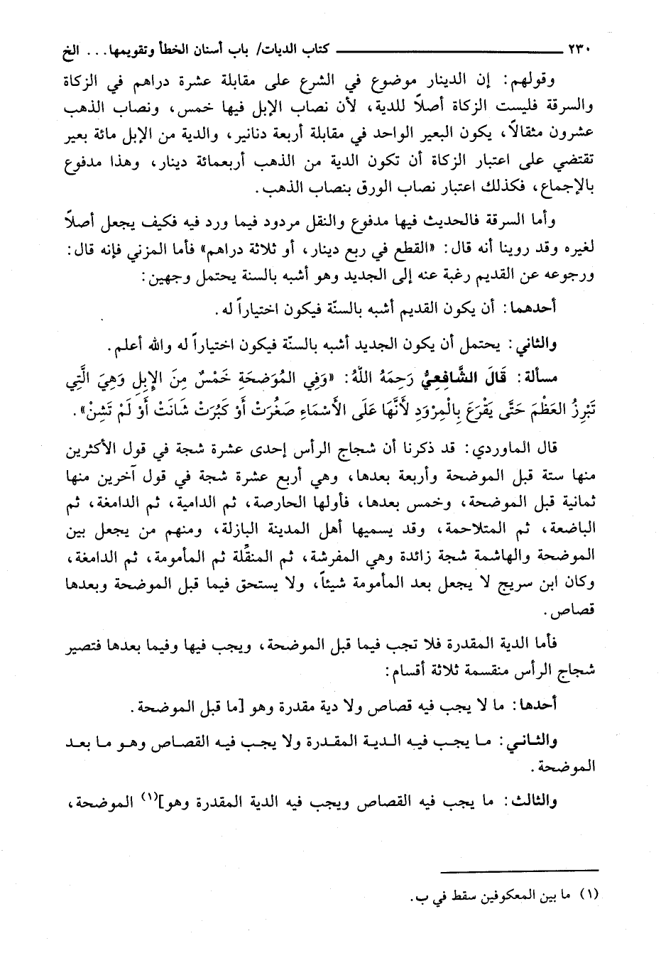 فَأَمَّا الدِّيَةُ الْمُقَدَّرَةُ فَلَا تَجِبُ فِيمَا قَبْلَ الْمُوضِحَةِ، وَيَجِبْ فِيهَا وَفِيمَا بَعْدَهَا فَتَصِيرُ شِجَاجُ الرَّأْسِ مُنْقَسِمَةً ثَلَاثَةَ أَقْسَامٍ: