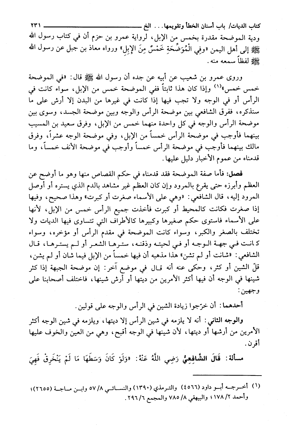 وَرَوَى عَمْرُو بْنُ شُعَيْبٍ عَنْ أَبِيهِ عَنْ جَدِّهِ أَنَّ رَسُولَ اللَّهِ - صَلَّى اللَّهُ عَلَيْهِ وَسَلَّم َ - قَالَ: " فِي الْمُوضِحَةِ خَمْسٌ خَمْسٌ " وَإِذَا كَانَ هَذَا ثَابِتًا فَفِي الْمُوضِحَةِ خَمْسٌ مِنَ الْإِبِلِ، سَوَاءٌ كَانَتْ فِي الرَّأْسِ أَوْ فِي الْوَجْهِ وَلَا تَجِبُ فِيهَا إِذَا كَانَتْ فِي غَيْرِهَا مِنَ الْبَدَنِ إِلَّا أَرْشٌ عَلَى مَا سَنَذْكُرُهُ، فَفَرَّقَ الشَّافِعِيُّ بَيْنَ مُوضِحَةِ الرَّأْسِ وَالْوَجْهِ وَبَيْنَ مُوضِحَةِ الْجَسَدِ، وَسَوَّى بَيْنَ مُوضِحَةِ الرَّأْسِ وَالْوَجْهِ فِي كُلِّ وَاحِدَةٍ مِنْهُمَا خَمْسٌ مِنَ الْإِبِلِ، وَفَرَّقَ سَعِيدُ بْنُ الْمُسَيَّبِ بَيْنَهُمَا فَأَوْجَبَ فِي مُوضِحَةِ الرَّأْسِ خَمْسًا مِنَ الْإِبِلِ، وَفِي مُوضِحَةِ الْوَجْهِ عَشْرًا، وَفَرَّقَ مَالِكٌ بَيْنَهُمَا فَأَوْجَبَ فِي مُوضِحَةِ الرَّأْسِ خَمْسًا وَأَوْجَبَ فِي مُوضِحَةِ الْأَنْفِ خَمْسًا، وَمَا قَدَّمْنَاهُ مِنْ عُمُومِ الْأَخْبَارِ دَلِيلٌ عَلَيْهَا.