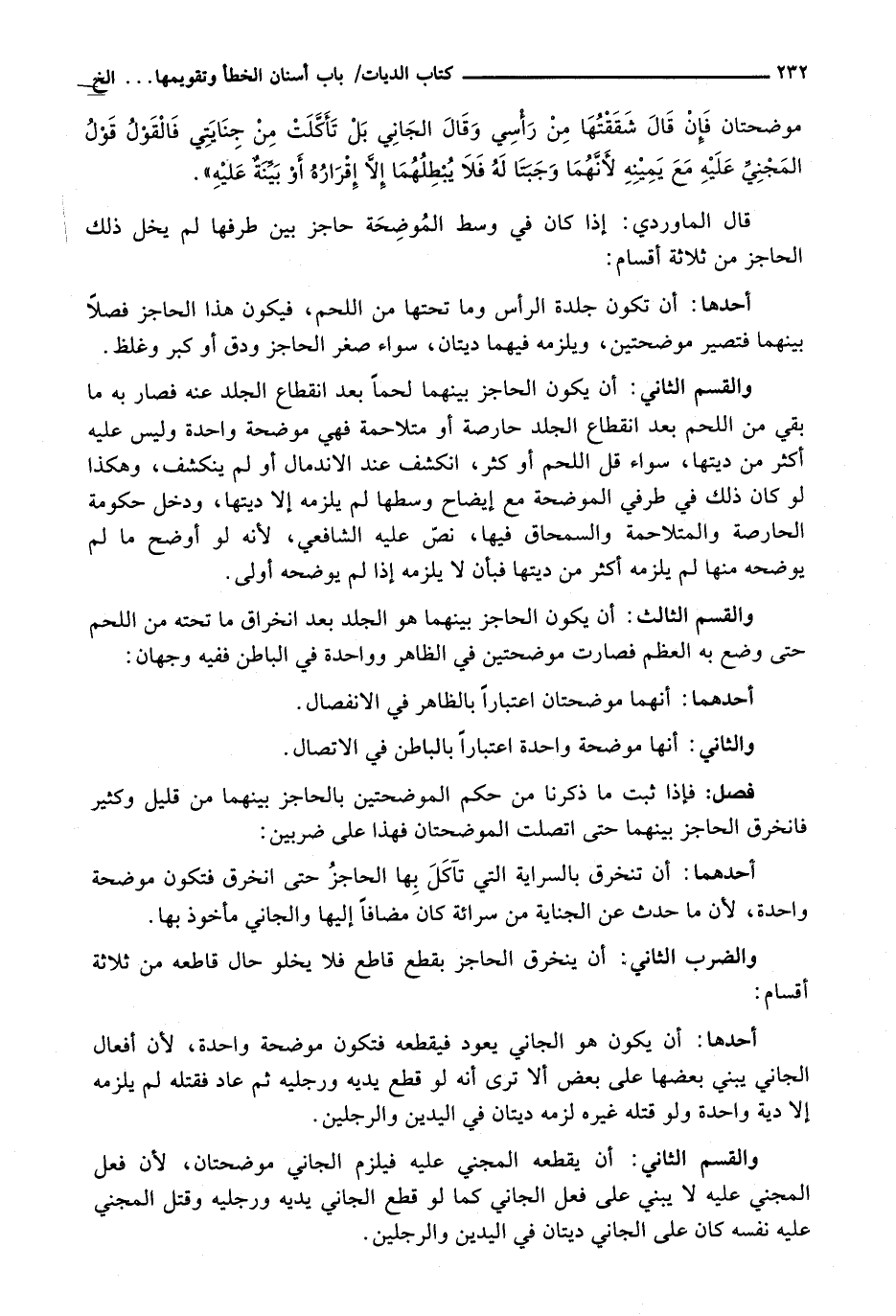 وَالْقِسْمُ الثَّانِي: أَنْ يَكُونَ الْحَاجِزُ بَيْنَهُمَا لَحْمًا بَعْدَ انْقِطَاعِ الْجِلْدِ عَنْهُ فَصَارَ بِهِ مَا بَقِيَ مِنَ اللَّحْمِ بَعْدَ انْقِطَاعِ الْجِلْدِ حَارِصَةً أَوْ مُتَلَاحِمَةً فَهِيَ مُوضِحَةٌ وَاحِدَةٌ وَلَيْسَ عَلَيْهِ أَكْثَرُ مِنْ دِيَتِهَا، سَوَاءٌ قَلَّ اللَّحْمُ أَوْ كَثُرَ، انْكَشَفَ عِنْدَ الِانْدِمَالِ أَوْ لَمْ يَنْكَشِفْ، وَهَكَذَا لَوْ كَانَ ذَلِكَ فِي طَرَفَيِ الْمُوضِحَةِ مَعَ إِيضَاحِ وَسَطِهَا لَمْ يَلْزَمْهُ إِلَّا دِيَتُهَا، وَدَخَلَ حُكُومَةُ الْحَارِصَةِ وَالْمُتَلَاحِمَةِ وَالسِّمْحَاقِ فِيهَا، نَصَّ عَلَيْهِ الشَّافِعِيُّ، لِأَنَّهُ لَوْ أَوْضَحَ مَا لَمْ يُوَضِّحْهُ مِنْهَا لَمْ يَلْزَمْهُ أَكْثَرُ مِنْ دِيَتِهَا فَبِأَنْ لَا يَلْزَمَهُ إِذَا لَمْ يُوَضِّحْهُ أَوْلَى.