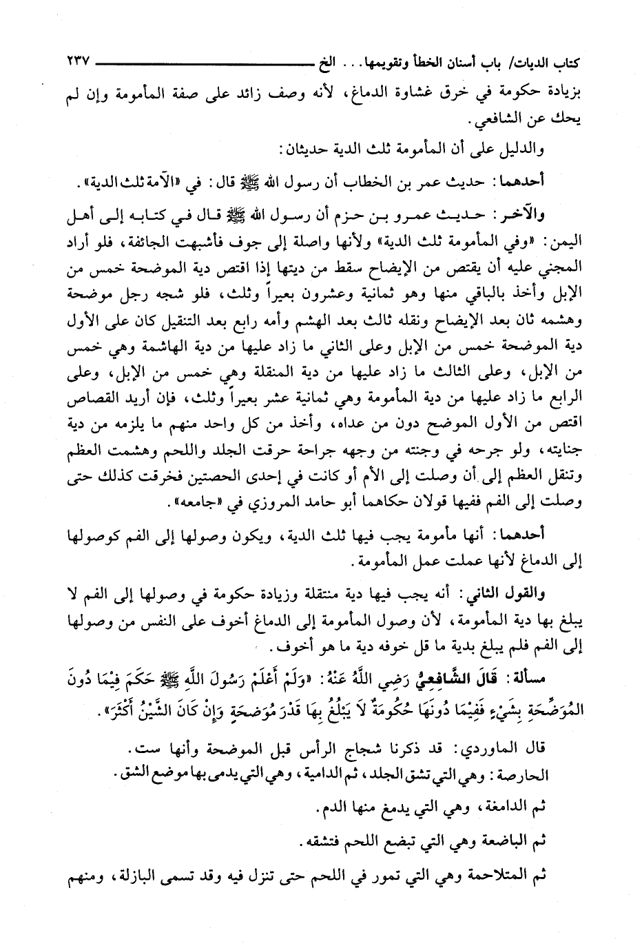وَالْآخَرُ: حَدِيثُ عَمْرُو بْنُ حَزْمٍ أَنَّ رَسُولَ اللَّهِ - صَلَّى اللَّهُ عَلَيْهِ وَسَلَّم َ - قَالَ فِي كِتَابِهِ إِلَى أَهْلِ الْيَمَنِ: " وَفِي الْمَأْمُومَةِ ثُلُثُ الدِّيَةِ " وَلِأَنَّهَا وَاصِلَةٌ إِلَى جَوْفٍ فَأَشْبَهَتِ الْجَائِفَةَ، فَلَوْ أَرَادَ الْمَجْنِيُّ عَلَيْهِ أَنْ يَقْتَصَّ مِنَ الْإِيضَاحِ سَقَطَ مِنْ دِيَتِهَا إِذَا اقتص دية الموضحة خمس مِنَ الْإِبِلِ وَأَخْذَ بِالْبَاقِي مِنْهَا وَهُوَ ثَمَانِيَةٌ وَعِشْرُونَ بَعِيرًا وَثُلُثٌ، فَلَوْ شَجَّهُ رَجُلٌ مُوضِحَةً وَهَشَمَهُ ثَانٍ بَعْدِ الْإِيضَاحِ وَنَقَلَهُ ثَالِثٌ بَعْدِ الْهَشْمِ وَأَمَّهُ رَابِعٌ بَعْدِ التَّنْقِيلِ كَانَ عَلَى الأول دية الموضحة خمس مِنَ الْإِبِلِ وَعَلَى الثَّانِي مَا زَادَ عَلَيْهَا مِنْ دِيَةِ الْهَاشِمَةِ وَهِيَ خَمْسٌ مِنَ الْإِبِلِ، وَعَلَى الثَّالِثِ مَا زَادَ عَلَيْهَا مِنْ دِيَةِ الْمُنَقِّلَةِ وَهِيَ خَمْسٌ مِنَ الْإِبِلِ، وَعَلَى الرَّابِعِ مَا زَادَ عَلَيْهَا مِنْ دِيَةِ الْمَأْمُومَةِ وَهِيَ ثَمَانِيَةَ عَشَرَ بَعِيرًا وَثُلُثٌ، فَإِنْ أُرِيدَ الْقِصَاصُ اقْتُصَّ مِنَ الْأَوَّلِ الْمُوضِحِ دُونَ مَنْ عَدَاهُ، وَأُخِذَ مِنْ كُلِّ وَاحِدٍ مِنْهُمْ مَا يَلْزَمُهُ مِنْ دِيَةِ جِنَايَتِهِ، وَلَوْ جَرَحَهُ فِي وَجْنَتِهِ مِنْ وَجْهِهِ جِرَاحَةً حَرَقَتِ الْجِلْدَ وَاللَّحْمَ وَهَشَمَتِ الْعَظْمَ وَتنَقَلَّ الْعَظْمُ إِلَى أَنْ وَصَلَتْ إِلَى الْأُمِّ أَوْ كَانَتْ فِي إِحْدَى الْحِصَّتَيْنِ فَخَرَقَتْ كَذَلِكَ حَتَّى وَصَلَتْ إِلَى الْفَمِ فَفِيهَا قَوْلَانِ حَكَاهُمَا أَبُو حَامِدٍ الْمَرْوَزِيُّ فِي " جَامِعِهِ ".