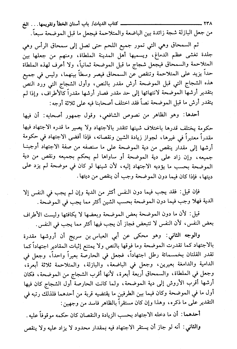 وَالْوَجْهُ الثَّانِي: وَهُوَ مَحْكِيٌّ عَنْ أَبِي الْعَبَّاسِ بْنِ سُرَيْجٍ أَنَّ أُرُوشَهَا مُقَدَّرَةٌ بِالِاجْتِهَادِ كَمَا تَقَدَّرَتِ الْمُوضِحَةُ وَمَا فَوْقَهَا بِالنَّصِّ وَلَا يَمْتَنِعُ إِثْبَاتُ الْمَقَادِيرِ اجْتِهَادًا كَمَا تُقَدَّرُ الْقُلَّتَانِ بِخَمْسِمِائَةِ رِطْلٍ اجْتِهَادًا، فَجَعَلَ فِي الْحَارِصَةِ بَعِيرًا وَاحِدًا، وَجَعَلَ فِي الدَّامِيَةِ وَالدَّامِغَةِ بَعِيرَيْنِ، وَجَعَلَ فِي الْبَاضِعَةِ، وَالْبَازِلَةِ، وَالْمُتَلَاحِمَةِ ثَلَاثَةَ أَبْعِرَةٍ، وَجَعَلَ فِي الْمِلْطَاةِ، وَالسِّمْحَاقِ أَرْبَعَةَ أَبْعِرَةٍ، لِأَنَّهَا أَقْرَبُ الشِّجَاجِ مِنَ الْمُوضِحَةِ، فَكَانَ أَرْشُهَا أَقْرَبَ الْأُرُوشِ إِلَى دِيَةِ الْمُوضِحَةِ، وَلَمَّا كَانَتِ الْحَارِصَةُ أَوَّلَ الشِّجَاجِ كَانَ فِيهَا أَوَّلُ مَا فِي الْمُوضِحَةِ وَكَانَ فِيمَا بَيْنَ الطَّرَفَيْنِ مَا يَقْتَضِيهِ قُرْبَةً مِنْ أَحَدِهِمَا فَلِذَلِكَ رَتَّبَهُ فِي التَّقْدِيرِ عَلَى مَا ذَكَرَهُ، وَهَذَا وَإِنْ كَانَ مُسْتَقِرًّا بالظاهر فَاسِدٌ مِنْ وَجْهَيْنِ: