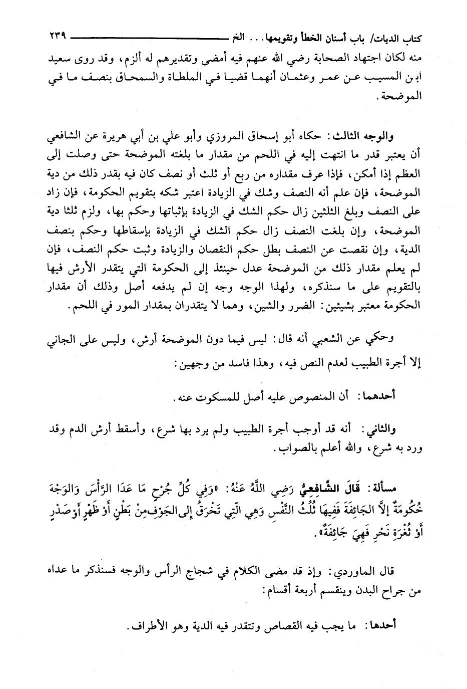 وَالْوَجْهُ الثَّالِثُ: حَكَاهُ أَبُو إِسْحَاقَ الْمَرْوَزِيُّ وَأَبُو عَلِيِّ بْنُ أَبِي هُرَيْرَةَ عَنِ الشَّافِعِيِّ أَنْ يُعْتَبَرَ قَدْرُ مَا انْتَهَتْ إِلَيْهِ فِي اللَّحْمِ مِنْ مِقْدَارِ مَا بَلَغَتْهُ الْمُوضِحَةُ حَتَّى وَصَلَتْ إِلَى الْعَظْمِ إِذَا أَمْكَنَ، فَإِذَا عُرِفَ مِقْدَارُهُ مِنْ رُبُعٍ أَوْ ثُلُثٍ أَوْ نِصْفٍ كَانَ فِيهِ بِقَدْرِ ذَلِكَ مِنْ دِيَةِ الْمُوضِحَةِ، فَإِنْ عَلِمَ أَنَّهُ النِّصْفُ وَشَكَّ فِي الزِّيَادَةِ اعْتَبَرَ شَكَّهُ بِتَقْوِيمِ الْحُكُومَةِ، فَإِنْ زَادَ عَلَى النِّصْفِ وَبَلَغَ الثُّلُثَيْنِ زَالَ حُكْمُ الشَّكِّ فِي الزِّيَادَةِ بِإِثْبَاتِهَا وَحُكِمَ بِهَا، وَلَزِمَ ثُلُثَا دِيَةِ الْمُوضِحَةِ، وَإِنْ بَلَغَتِ النِّصْفَ زَالَ حُكْمُ الشَّكِّ فِي الزِّيَادَةِ بِإِسْقَاطِهَا وَحُكِمَ بِنِصْفِ الدِّيَةِ، وَإِنْ نَقَصَتْ عَنِ النِّصْفِ بَطَلَ حُكْمُ النُّقْصَانِ وَالزِّيَادَةِ وَثَبَتَ حُكْمُ النِّصْفِ، فَإِنْ لَمْ يَعْلَمْ مِقْدَارَ ذَلِكَ مِنَ الْمُوضِحَةِ عُدِلَ حِينَئِذٍ إِلَى الْحُكُومَةِ الَّتِي يَتَقَدَّرُ الْأَرْشُ فِيهَا بِالتَّقْوِيمِ عَلَى مَا سَنَذْكُرُهُ، وَلِهَذَا الْوَجْهِ وَجْهٌ إِنْ لَمْ يَدْفَعْهُ أَصْلٌ وَذَلِكَ أَنَّ مِقْدَارَ الْحُكُومَةِ مُعْتَبَرٌ بِشَيْئَيْنِ: الضَّرَرِ وَالشَّيْنِ، وَهُمَا لَا يَتَقَدَّرَانِ بِمِقْدَارِ الْمَوْرِ فِي اللَّحْمِ.