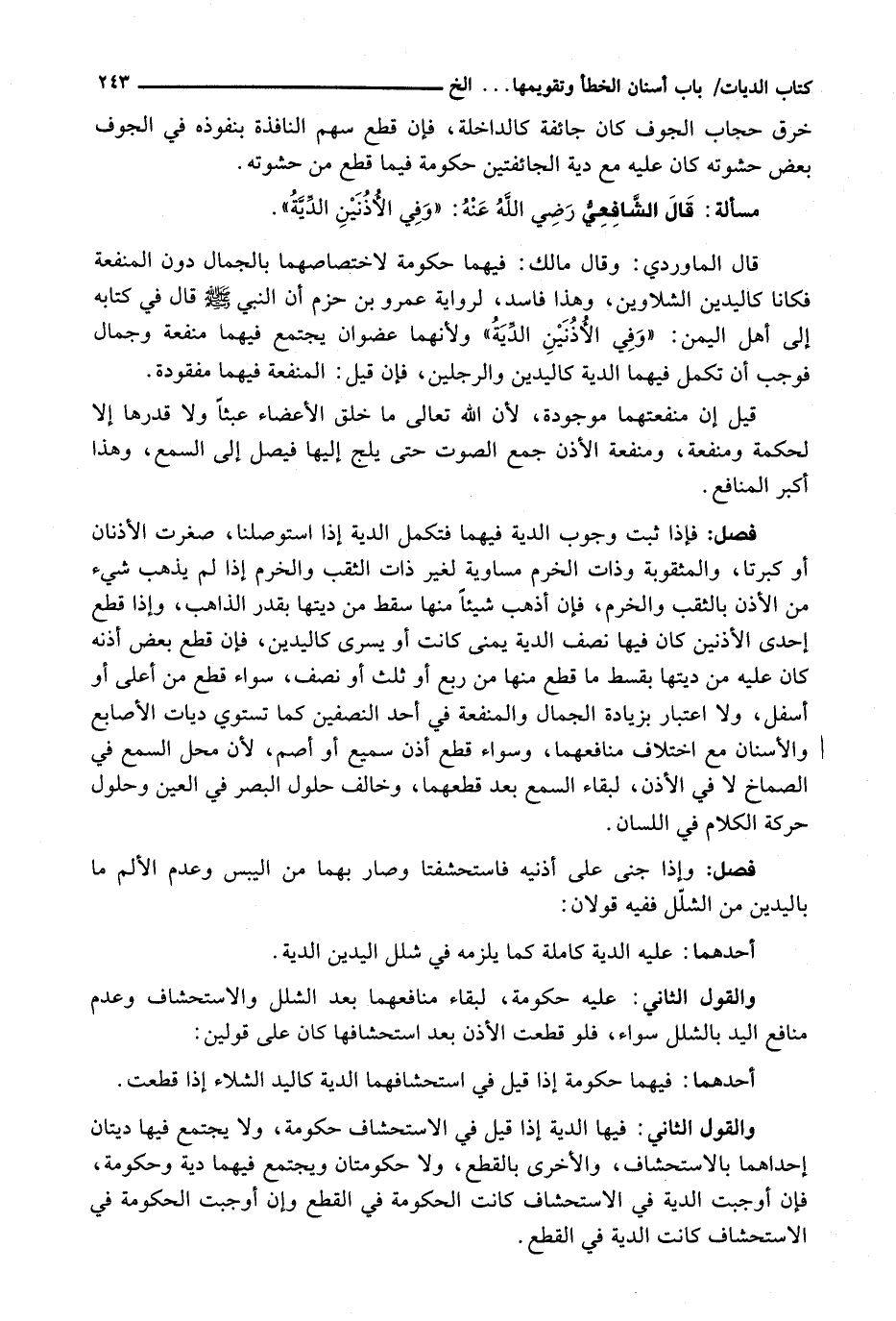 فَإِذَا ثَبَتَ وُجُوبُ الدِّيَةِ فِيهِمَا فَتَكْمُلُ الدية إذا استوصلنا، صَغُرَتِ الْأُذُنَانِ أَوْ كَبُرَتَا، وَالْمَثْقُوبَةُ وَذَاتُ الْخُرْمِ مُسَاوِيَةٌ لِغَيْرِ ذَاتِ الثُّقْبِ وَالْخُرْمِ إِذَا لَمْ يَذْهَبْ شَيْءٌ مِنَ الْأُذُنِ بِالثَّقْبِ وَالْخَرْمِ، فَإِنْ أَذْهَبْ شَيْئًا مِنْهَا سَقَطَ مِنْ دِيَتِهَا بِقَدْرِ الذَّاهِبِ، وَإِذَا قَطَعَ إِحْدَى الْأُذُنَيْنِ كَانَ فِيهَا نِصْفُ الدِّيَةِ يُمْنَى كَانَتْ أَوْ يُسْرَى كَالْيَدَيْنِ، فَإِنْ قَطَعَ بَعْضَ أُذُنِهِ كَانَ عَلَيْهِ مِنْ دِيَتِهَا بِقِسْطِ مَا قَطَعَ مِنْهَا مِنْ رُبُعٍ أَوْ ثُلُثٍ أَوْ نِصْفٍ، سَوَاءٌ قَطَعَ مِنْ أَعْلَى أَوْ أَسْفَلَ، وَلَا اعْتِبَارَ بِزِيَادَةِ الْجَمَالِ وَالْمَنْفَعَةِ فِي أَحَدِ النِّصْفَيْنِ كَمَا تَسْتَوِي دِيَاتُ الْأَصَابِعِ وَالْأَسْنَانِ مَعَ اخْتِلَافِ مَنَافِعِهِمَا، وَسَوَاءٌ قَطَعَ أُذُنَ سَمِيعٍ أَوْ أَصَمَّ، لِأَنَّ مَحَلَّ السَّمْعِ فِي الصِّمَاخِ لَا فِي الْأُذُنِ، لِبَقَاءِ السَّمْعِ بَعْدَ قَطْعِهِمَا، وَخَالَفَ حُلُولَ الْبَصَرِ فِي الْعَيْنِ وَحُلُولَ حَرَكَةِ الْكَلَامِ فِي اللِّسَانِ.