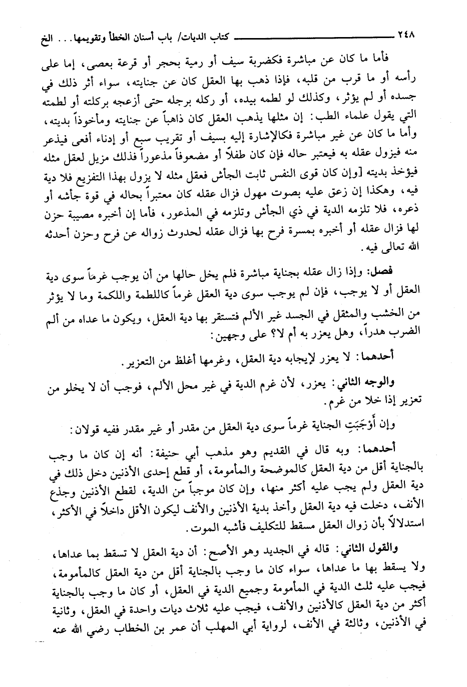 وَالْقَوْلُ الثَّانِي: قَالَهُ فِي الْجَدِيدِ وَهُوَ الْأَصَحُّ: إِنَّ دِيَةَ الْعَقْلِ لَا تَسْقُطُ بِمَا عَدَاهَا، وَلَا يَسْقُطُ بِهَا مَا عَدَاهَا، سَوَاءٌ كَانَ مَا وَجَبَ بِالْجِنَايَةِ أَقَلَّ مِنْ دِيَةِ الْعَقْلِ كَالْمَأْمُومَةِ، فَيَجِبُ عَلَيْهِ ثُلُثُ الدِّيَةِ فِي الْمَأْمُومَةِ وَجَمِيعُ الدِّيَةِ فِي الْعَقْلِ، أَوْ كَانَ مَا وَجَبَ بِالْجِنَايَةِ أَكَثَرَ مِنْ دِيَةِ الْعَقْلِ كَالْأُذُنَيْنِ وَالْأَنْفِ، فَيَجِبُ عَلَيْهِ ثَلَاثُ دِيَاتٍ وَاحِدَةٌ فِي الْعَقْلِ، وَثَانِيَةٌ فِي الْأُذُنَيْنِ، وَثَالِثَةٌ فِي الْأَنْفِ، لِرِوَايَةِ أَبِي الْمُهَلَّبِ أَنَّ عُمَرَ بْنَ الْخَطَّابِ رَضِيَ اللَّهُ عَنْهُ