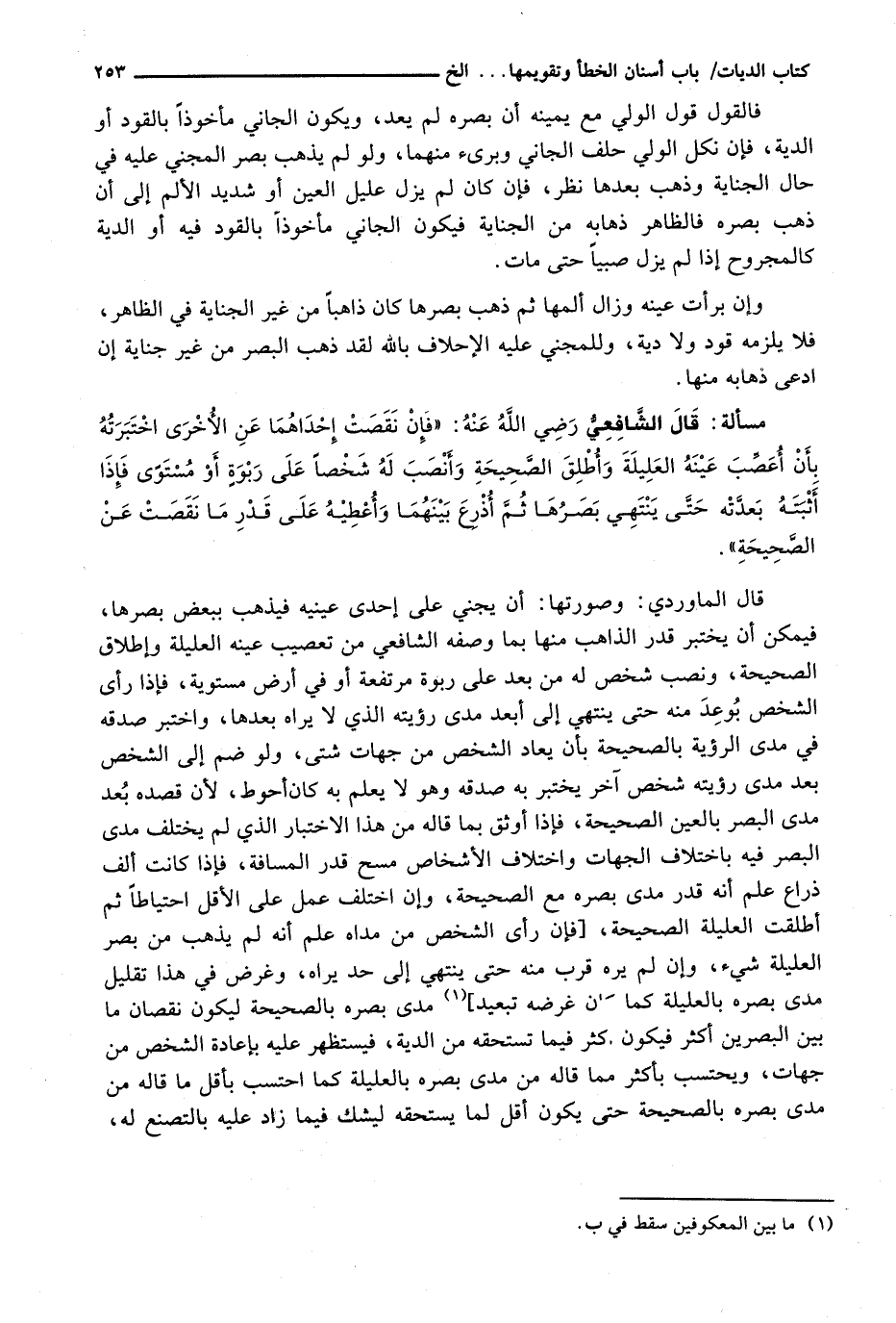 قَالَ الْمَاوَرْدِيُّ: وَصُورَتُهَا، أَنْ يَجْنِيَ عَلَى إِحْدَى عَيْنَيْهِ فَيَذْهَبُ بِبَعْضِ بَصَرِهَا، فَيُمْكِنُ أَنْ يُخْتَبَرَ قَدْرُ الذَّاهِبِ مِنْهَا بِمَا وَصَفَهُ الشَّافِعِيُّ مِنْ تَعْصِيبِ عَيْنِهِ الْعَلِيلَةِ وَإِطْلَاقِ الصَّحِيحَةِ، وَنَصْبِ شَخْصٍ لَهُ مِنْ بُعْدٍ عَلَى رَبْوَةٍ مُرْتَفِعَةٍ أَوْ فِي أَرْضٍ مُسْتَوِيَةٍ، فَإِذَا رَأَى الشَّخْصَ بُوعِدَ مِنْهُ حَتَّى يَنْتَهِيَ إِلَى أَبْعَدِ مَدَى رُؤْيَتِهِ الَّذِي لَا يَرَاهُ بَعْدَهَا، وَاخْتُبِرَ صِدْقُهُ فِي مَدَى الرُّؤْيَةِ بِالصَّحِيحَةِ بِأَنْ يُعَادَ الشَّخْصُ مِنْ جِهَاتٍ شَتَّى، وَلَوْ ضُمَّ إِلَى الشَّخْصِ بَعْدَ مَدَى رُؤْيَتِهِ شَخْصٌ آخَرُ يُخْتَبَرُ بِهِ صِدْقُهُ وَهُوَ لَا يَعْلَمُ بِهِ كَانَ أَحْوَطَ، لِأَنَّ قَصْدَهُ بُعْدَ مَدَى الْبَصَرِ بِالْعَيْنِ الصَّحِيحَةِ، فَإِذَا أَوْثَقَ بِمَا قَالَهُ مِنْ هَذَا الِاخْتِبَارِ الَّذِي لَمْ يَخْتَلِفْ مَدَى الْبَصَرِ فِيهِ بِاخْتِلَافِ الْجِهَاتِ واختلاف الأشخاص مسح قدر الْمَسَافَةَ، فَإِذَا كَانَتْ أَلْفَ ذِرَاعٍ عُلِمَ أَنَّهُ قَدْرُ مَدَى بَصَرِهِ مَعَ الصَّحِيحَةِ، وَإِنِ اخْتَلَفَ عَمِلَ عَلَى الْأَقَلِّ احْتِيَاطًا ثُمَّ أُطْلِقَتِ الْعَلِيلَةُ الصَّحِيحَةُ، [فَإِنْ رَأَى الشَّخْصَ مِنْ مَدَاهُ عُلِمَ أَنَّهُ لَمْ يَذْهَبْ مِنْ بَصَرِ الْعَلِيلَةِ شَيْءٌ، وَإِنْ لَمْ يَرَهُ قَرِّبَ مِنْهُ حَتَّى يَنْتَهِيَ إلى حد يراه، وغرض في هذا تقليل مدى بَصَرِهِ بِالْعَلِيلَةِ كَمَا كَانَ غَرَضُهُ تَبْعِيدَ] مَدَى بَصَرِهِ بِالصَّحِيحَةِ لِيَكُونَ نُقْصَانُ مَا بَيْنَ الْبَصَرَيْنِ أَكْثَرَ فَيَكُونُ أَكْثَرَ فِيمَا تَسْتَحِقُّهُ مِنَ الدِّيَةِ، فَيَسْتَظْهِرُ عَلَيْهِ بِإِعَادَةِ الشَّخْصِ مِنْ جِهَاتٍ، وَيُحْتَسَبُ بِأَكْثَرَ مِمَّا قَالَهُ مِنْ مَدَى بَصَرِهِ بِالْعَلِيلَةِ كَمَا احْتُسِبَ بِأَقَلِّ مَا قَالَهُ مِنْ مَدَى بَصَرِهِ بِالصَّحِيحَةِ حَتَّى يَكُونَ أَقَلَّ لِمَا يَسْتَحِقُّهُ لِيَشُكَّ فِيمَا زَادَ عَلَيْهِ بِالتَّصَنُّعِ لَهُ،