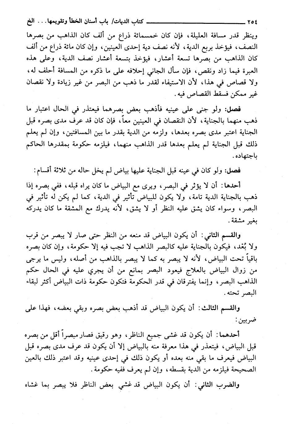 أَحَدُهُمَا أَنْ يَكُونَ قَدْ غَشِيَ جَمِيعَ النَّاظِرِ، وَهُوَ رَقِيقٌ فَصَارَ مُبْصِرًا أَقَلَّ مِنْ بَصَرِهِ قَبْلَ الْبَيَاضِ، فَيَتَعَذَّرُ فِي هَذَا مَعْرِفَةٌ مِنْهُ بِالْبَيَاضِ إِلَّا أَنْ يَكُونَ قَدْ عَرَفَ مَدَى بَصَرِهِ قَبْلَ الْبَيَاضِ فَيَعْرِفُ مَا بَقِيَ مِنْهُ بَعْدَهُ أَوْ يَكُونُ ذَلِكَ فِي إِحْدَى عَيْنَيْهِ وَقَدِ اعْتُبِرَ ذَلِكَ بِالْعَيْنِ الصَّحِيحَةِ فَيَلْزَمُهُ مِنَ الدِّيَةِ بِقِسْطِهِ، وَإِنْ لَمْ يَعْرِفْ فَفِيهِ حُكُومَةٌ.