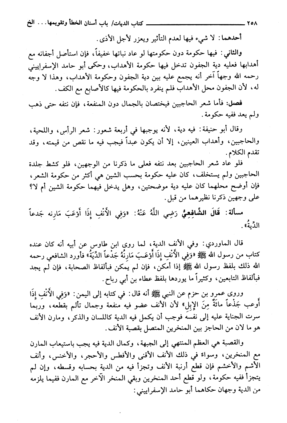 وَالْقَصَبَةُ هِيَ الْعَظْمُ الْمُنْتَهِي إِلَى الْجَبْهَةِ، وَكَمَالُ الدِّيَةِ فِيهِ يَجِبُ بِاسْتِيعَابِ الْمَارِنِ مَعَ الْمَنْخَرَيْنِ، وَسَوَاءٌ فِي ذَلِكَ الْأَنْفُ الْأَقْنَى وَالْأَفْطَسُ وَالْأَحْجَرُ، وَالْأَخْنَسُ، وَأَنْفُ الْأَشَمِّ وَالْأَخْشَمُ فَإِنْ قَطَعَ أَرْنَبَةَ الْأَنْفِ وَتَجَزَّأَ فِيهِ مِنَ الدِّيَةِ بِحِسَابِهِ وَقِسْطِهِ، وَإِنْ لَمْ يَتَجَزَّأْ فَفِيهِ حُكُومَةٌ، وَلَوْ قَطَعَ أَحَدَ الْمَنْخَرَيْنِ وَبَقِيَ الْمَنْخَرُ الْآخَرُ مَعَ الْمَارِنِ فَفِيمَا يَلْزَمُهُ مِنَ الدِّيَةِ وَجْهَانِ حَكَاهُمَا أَبُو حَامِدٍ الْإِسْفَرَايِينِيُّ: