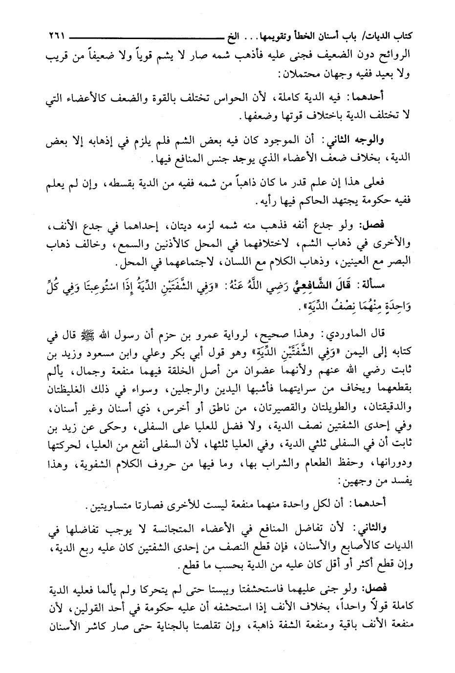 قَالَ الْمَاوَرْدِيُّ: وَهَذَا صَحِيحٌ، لِرِوَايَةِ عَمْرُو بْنُ حَزْمٍ أَنَّ رَسُولَ اللَّهِ - صَلَّى اللَّهُ عَلَيْهِ وَسَلَّم َ - قَالَ فِي كِتَابِهِ إِلَى الْيَمَنِ " وَفِي الشَّفَتَيْنِ الدِّيَةُ " وَهُوَ قَوْلُ أَبِي بَكْرٍ وَعَلِيٍّ وَابْنِ مَسْعُودٍ وَزَيْدِ بْنِ ثَابِتٍ رَضِيَ اللَّهُ عَنْهُمْ وَلِأَنَّهُمَا عُضْوَانِ مِنْ أَصْلِ الْخِلْقَةِ فِيهِمَا مَنْفَعَةٌ وَجَمَالٌ، يَأْلَمُ بِقَطْعِهِمَا وَيُخَافُ مِنْ سِرَايَتِهِمَا فَأَشْبَهَا الْيَدَيْنِ وَالرِّجْلَيْنِ، وَسَوَاءٌ فِي ذَلِكَ الْغَلِيظَتَانِ وَالدَّقِيقَتَانِ، وَالطَّوِيلَتَانِ وَالْقَصِيرَتَانِ، مِنْ نَاطِقٍ أَوْ أَخْرَسَ، ذِي أَسْنَانٍ وَغَيْرِ أَسْنَانٍ، وَفِي إِحْدَى الشَّفَتَيْنِ نِصْفُ الدِّيَةِ، وَلَا فَضْلَ لِلْعُلْيَا عَلَى السُّفْلَى، وَحُكِيَ عَنْ زَيْدِ بْنِ ثَابِتٍ أَنَّ فِي السُّفْلَى ثُلُثَيِ الدِّيَةِ، وَفِي الْعُلْيَا ثُلُثُهَا، لِأَنَّ السُّفْلَى أَنْفَعُ مِنَ الْعُلْيَا، لِحَرَكَتِهَا وَدَوَرَانِهَا، وَحِفْظِ الطَّعَامِ وَالشَّرَابِ بِهَا، وَمَا فِيهَا مِنْ حُرُوفِ الْكَلَامِ الشَّفَوِيَّةِ، وَهَذَا يَفْسَدُ مِنْ وَجْهَيْنِ:
