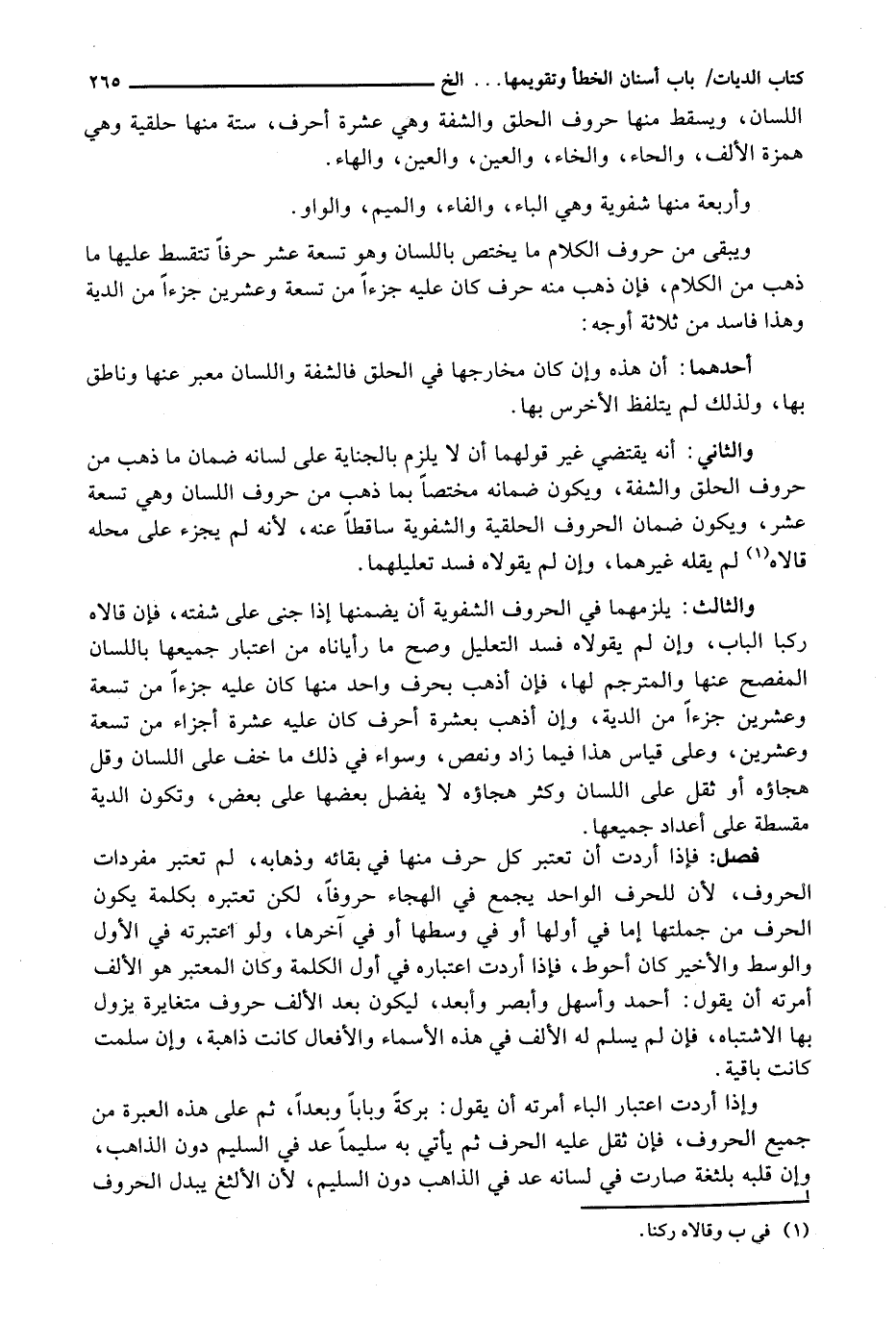 وَيَبْقَى مِنْ حُرُوفِ الْكَلَامِ مَا يَخْتَصُّ بِاللِّسَانِ وَهُوَ تِسْعَةَ عَشَرَ حَرْفًا تَتَقَسَّطُ عَلَيْهَا مَا ذَهَبَ مِنَ الْكَلَامِ، فَإِنْ ذَهَبَ مِنْهُ حَرْفٌ كَانَ عَلَيْهِ جُزْءًا مِنْ تِسْعَةٍ وَعِشْرِينَ جُزْءًا مِنَ الدِّيَةِ وَهَذَا فَاسِدٌ مِنْ ثلاثة أوجه: