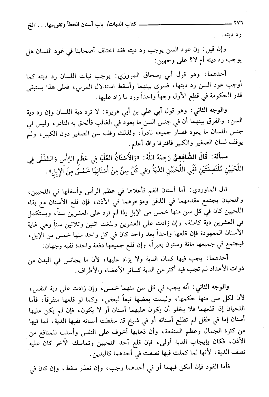 قَالَ الْمَاوَرْدِيُّ: أَمَّا أَسْنَانُ الْفَمِ فَأَعْلَاهَا فِي عَظْمِ الرَّأْسِ وَأَسْفَلُهَا فِي اللَّحْيَيْنِ، وَاللَّحْيَانِ يَجْتَمِعُ مُقَدَّمُهُمَا فِي الذَّقْنِ وَمُؤَخَّرُهُمَا فِي الْأُذُنِ، فَإِنْ قَلَعَ الْأَسْنَانَ مَعَ بَقَاءِ اللَّحْيَيْنِ كَانَ فِي كُلِّ سِنٍّ مِنْهَا خَمْسٌ من الإبل إذا لم ترد عَلَى الْعِشْرِينَ سِنًّا، وَيُسْتَكْمَلُ فِي الْعِشْرِينَ دِيَةٌ كَامِلَةٌ، وَإِنْ زَادَتْ عَلَى الْعِشْرِينَ وَبَلَغَتِ اثْنَيْنِ وَثَلَاثِينَ سِنًّا وَهِيَ غَايَةُ الْأَسْنَانِ الْمَعْهُودَةِ فَإِنْ قَلَعَهَا وَاحِدًا بَعْدَ وَاحِدٍ كَانَ فِي كُلِّ واحد منهما خَمْسٌ مِنَ الْإِبِلِ، فَيَجْتَمِعُ فِي جَمِيعِهَا مِائَةٌ وَسِتُّونَ بَعِيرًا، وَإِنْ قَلَعَ جَمِيعِهَا دَفْعَةً وَاحِدَةً فَفِيهِ وَجْهَانِ:
