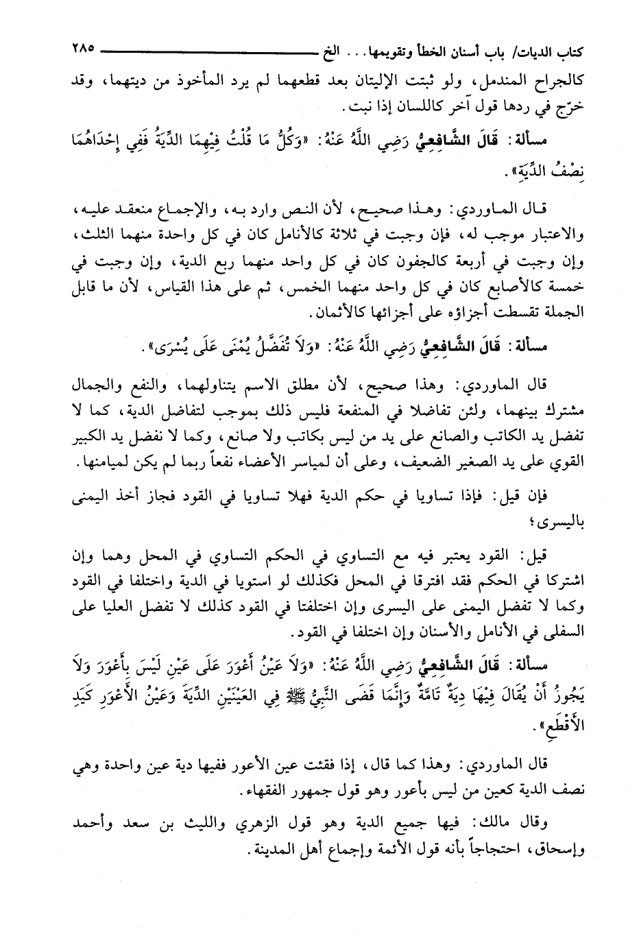 قَالَ الْمَاوَرْدِيُّ: وَهَذَا صَحِيحٌ، لِأَنَّ مُطْلَقَ الِاسْمِ يَتَنَاوَلُهُمَا، وَالنَّفْعَ وَالْجَمَالَ مُشْتَرَكٌ بَيْنَهُمَا، وَلَئِنْ تَفَاضَلَا فِي الْمَنْفَعَةِ فَلَيْسَ ذَلِكَ بِمُوجِبٍ لِتُفَاضِلِ الدِّيَةِ، كَمَا لَا تُفَضَّلُ يَدُ الْكَاتِبِ وَالصَّانِعِ عَلَى يَدِ مَنْ ليس بكاتب ولا صانع، وكما لا نفضل يَدُ الْكَبِيرِ الْقَوِيِّ عَلَى يَدِ الصَّغِيرِ الضَّعِيفِ، وَعَلَى أَنَّ لِمَيَاسِرِ الْأَعْضَاءِ نَفْعًا رُبَّمَا لَمْ يَكُنْ لِمَيَامِنِهَا.