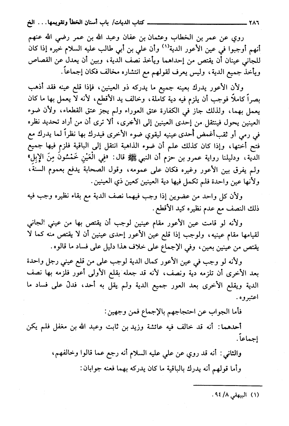 رُوِيَ عَنْ عُمَرُ بْنُ الْخَطَّابِ وَعُثْمَانُ بْنُ عَفَّانَ وَعَبْدُ اللَّهِ بْنُ عُمَرَ رَضِيَ اللَّهُ عَنْهُمْ أَنَّهُمْ أَوْجَبُوا فِي عَيْنِ الْأَعْوَرِ الدِّيَةَ وَأَنَّ عَلِيَّ بْنَ أَبِي طَالِبٍ عَلَيْهِ السَّلَامُ خَيَّرَهُ إِذَا كَانَ لِلْجَانِي عَيْنَانِ أَنْ يَقْتَصَّ مِنْ إِحْدَاهُمَا وَيَأْخُذَ نِصْفَ الدِّيَةِ، وَبَيْنَ أَنْ يَعْدِلَ عَنِ الْقِصَاصِ وَيَأْخُذَ جَمِيعَ الدِّيَةِ، وَلَيْسَ يُعْرَفُ لِقَوْلِهِمْ مَعَ انْتِشَارِهِ مُخَالِفٌ فَكَانَ إِجْمَاعًا.