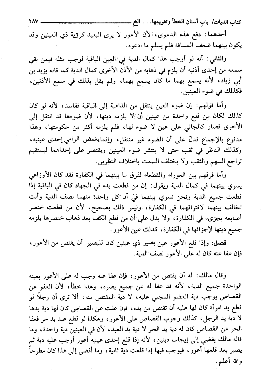 وَأَمَّا فَرْقُهُمْ بَيْنَ الْعَوْرَاءِ وَالْقَطْعَاءِ لِفَرْقِ مَا بَيْنَهُمَا فِي الْكَفَّارَةِ فَقَدْ كَانَ الْأَوْزَاعِيُّ يُسَوِّي بَيْنَهُمَا فِي كَمَالِ الدِّيَةِ وَيَقُولُ: إِنَّ مَنْ قُطِعَتْ يَدُهُ فِي الْجِهَادِ كَانَ فِي الْبَاقِيَةِ إِذَا قُطِعَتْ جَمِيعُ الدِّيَةِ وَنَحْنُ نُسَوِّي بَيْنَهُمَا فِي أَنَّ كُلَّ وَاحِدَةٍ مِنْهُمَا نِصْفُ الدِّيَةِ وَأَنْتَ تُخَالِفُ بَيْنَهُمَا لِافْتِرَاقِهِمَا فِي الْكَفَّارَةِ، وَلَيْسَ ذَلِكَ بِصَحِيحٍ، لِأَنَّ مَنْ قُطِعَتْ خِنْصَرُ أَصَابِعِهِ يُجْزِئُ فِي الْكَفَّارَةِ، وَلَا يَدُلُّ عَلَى أَنَّ مَنْ قَطَعَ الْكَفَّ بَعْدَ ذَهَابِ خِنْصَرِهَا يَلْزَمُهُ جَمِيعُ دِيَتِهَا لِإِجْزَائِهَا فِي الْكَفَّارَةِ، كَذَلِكَ عَيْنُ الْأَعْوَرِ.