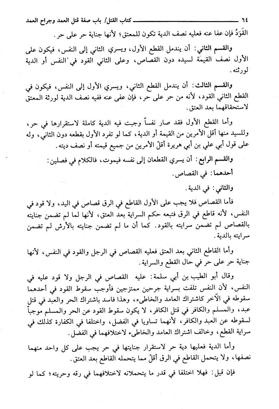 وَقَالَ أَبُو الطَّيِّبِ بْنُ أَبِي سَلَمَةَ: عَلَيْهِ الْقِصَاصُ فِي الرِّجْلِ وَلَا قَوَدَ عَلَيْهِ فِي النَّفْسِ، لِأَنَّ النَّفْسَ تَلِفَتْ بِسِرَايَةِ جُرْحَيْنِ مُمْتَزِجَيْنِ فَأَوْجَبَ سُقُوطُ الْقَوَدِ فِي أَحَدِهِمَا سُقُوطَهُ فِي الْآخَرِ كَاشْتِرَاكِ الْعَامِدِ وَالْخَاطِئِ، وَهَذَا فَاسِدٌ بِاشْتِرَاكِ الْحُرِّ وَالْعَبْدِ فِي قَتْلِ عَبْدٍ، وَالْمُسْلِمِ وَالْكَافِرِ فِي قَتْلِ الْكَافِرِ، لَا يَكُونُ سُقُوطُ الْقَوَدِ عَنِ الْحُرِّ وَالْمُسْلِمِ مُوجِبًا لِسُقُوطِهِ عَنِ الْعَبْدِ وَالْكَافِرِ، لِأَنَّهُمَا تَسَاوَيَا فِي الْفَضْلِ، وَاخْتَلَفَا فِي الْكَفَّارَةِ كَذَلِكَ فِي سِرَايَةِ الْقَطْعِ، وَخَالَفَ اشْتِرَاكَ الْعَامِدِ وَالْخَاطِئِ لِاخْتِلَافِهِمَا فِي الْفَضْلِ.