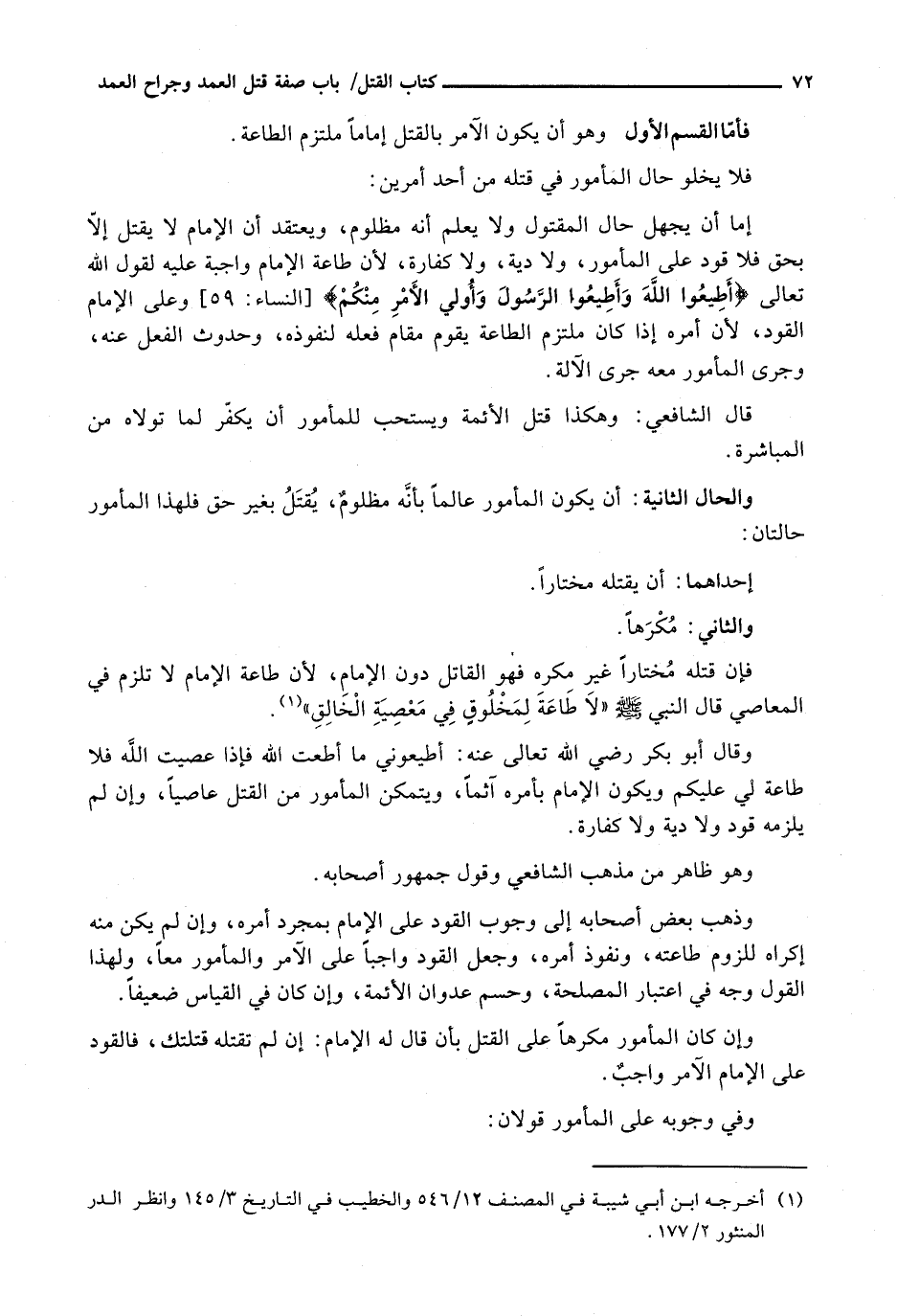 وَقَالَ أَبُو بَكْرٍ رَضِيَ اللَّهُ تَعَالَى عَنْهُ: أَطِيعُونِي مَا أَطَعْتُ اللَّهَ فَإِذَا عَصَيْتُ اللَّهَ فَلَا طَاعَةَ لِي عَلَيْكُمْ وَيَكُونُ الْإِمَامُ بِأَمْرِهِ آثِمًا، وَيَتَمَكَّنُ الْمَأْمُورُ مِنَ القَتْلِ عَاصِيًا، وَإِنْ لَمْ يَلْزَمْهُ قَوَدٌ وَلَا دِيَةَ وَلَا كَفَّارَةَ.