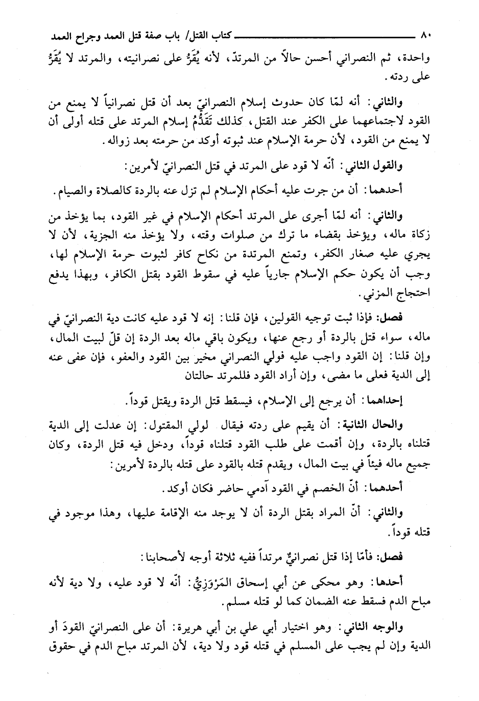 وَالْقَوْلُ الثَّانِي: أَنَّهُ لَا قَوَدَ عَلَى الْمُرْتَدِّ فِي قَتْلِ النَّصْرَانِيِّ لِأَمْرَيْنِ: أَحَدُهُمَا: أَنَّ مَنْ جَرَتْ عَلَيْهِ أَحْكَامُ الْإِسْلَامِ لَمْ تَزُلْ عَنْهُ بِالرِّدَّةِ كَالصَّلَاةِ وَالصِّيَامِ.