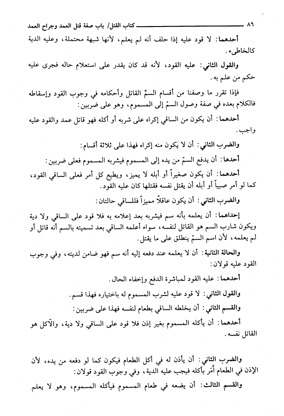 إِحْدَاهُمَا: أَنْ يُعْلِمَهُ بِأَنَّهُ سُمٌّ فَيَشْرَبَهُ بَعْدَ إِعْلَامِهِ بِهِ فَلَا قَوَدَ عَلَى السَّاقِي وَلَا دِيَةَ وَيَكُونُ شَارِبُ السُّمِّ هُوَ الْقَاتِلَ لِنَفْسِهِ، سَوَاءٌ أَعْلَمَهُ السَّاقِي بَعْدَ تَسْمِيَتِهِ بِالسُّمِّ أَنَّهُ قَاتِلٌ أَوْ لَمْ يُعْلِمْهُ، لِأَنَّ اسْمَ السُّمِّ يَنْطَلِقُ عَلَى مَا يَقْتُلُ.