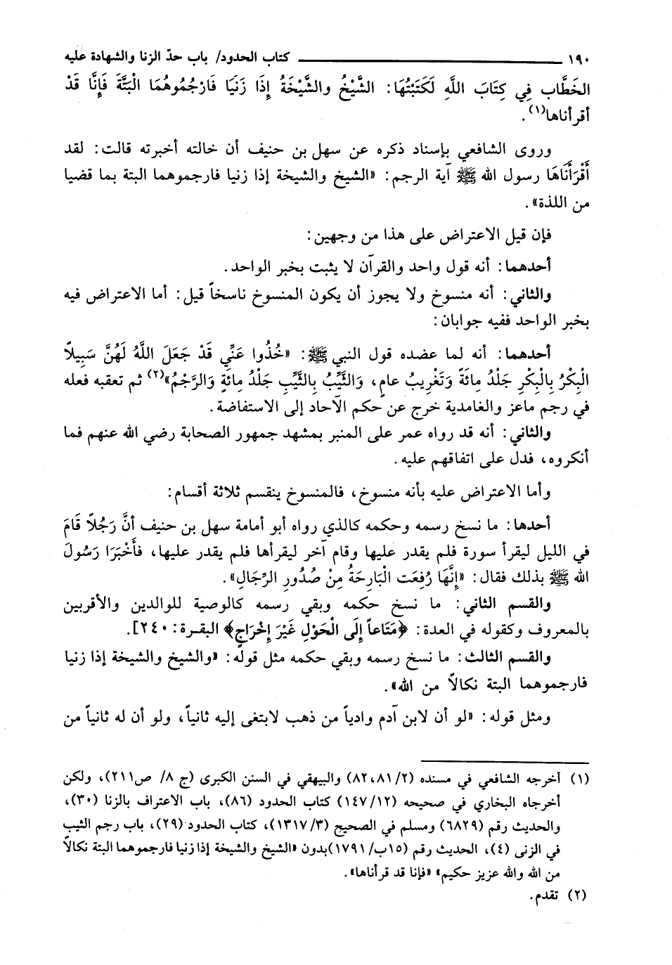 أَحَدُهُمَا: أَنَّهُ لَمَّا عَضَّدَهُ قَوْلُ النَّبِيِّ - صَلَّى اللَّهُ عَلَيْهِ وَسَلَّم َ -: " خُذُوا عَنِّي قَدْ جَعَلَ اللهُ لَهُنَّ سَبِيلًا الْبِكْرُ بِالْبِكْرِ جَلْدُ مِائَةٍ وَتَغْرِيبُ عَامٍ، وَالثَّيِّبُ بالثيب جلد مائة والرجم) ثم تعقبه فعله فِي رَجْمِ مَاعِزٍ وَالْغَامِدِيَّةِ خَرَجَ عَنْ حُكْمِ الْآحَادِ إِلَى الِاسْتِفَاضَةِ.