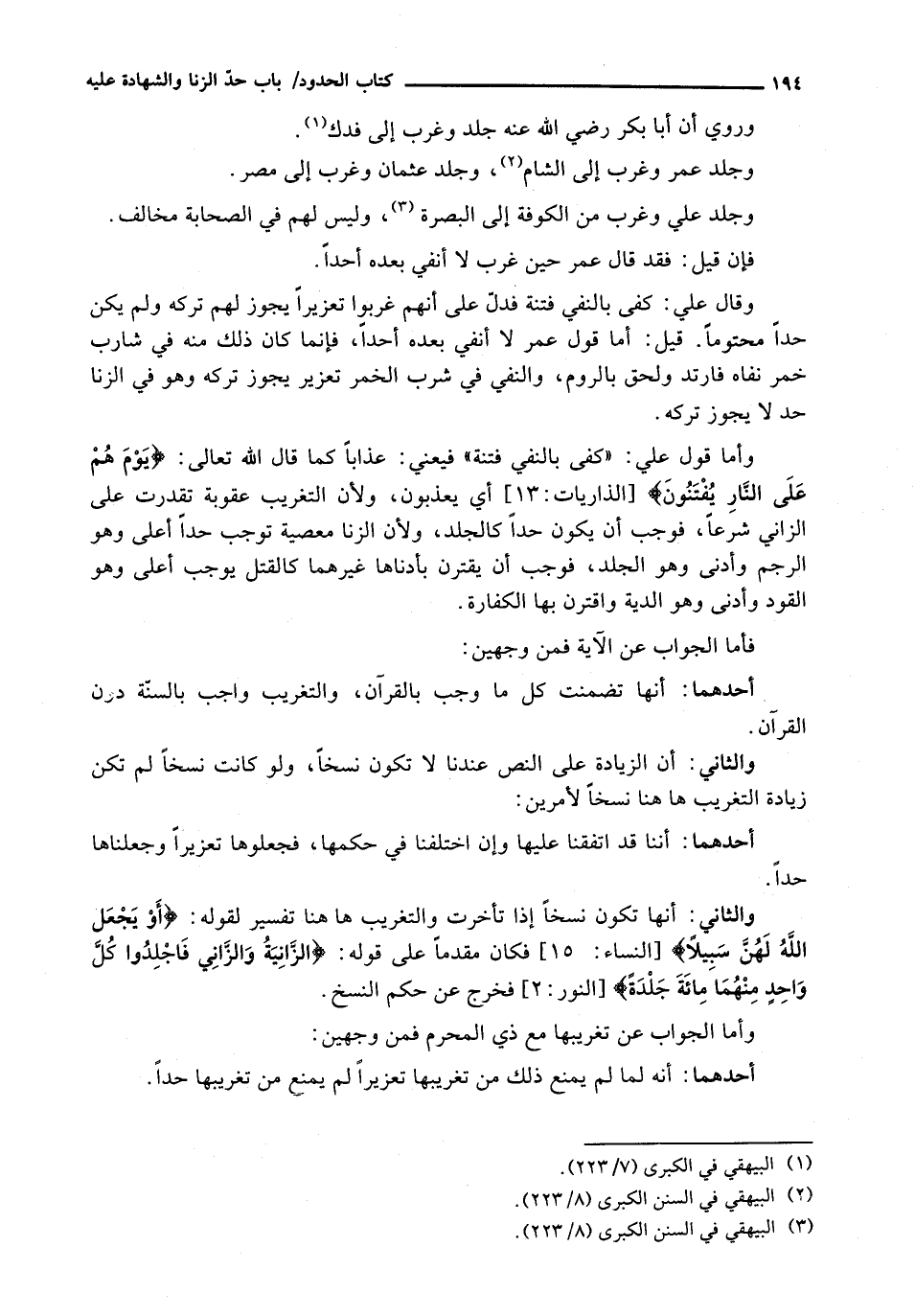وَأَمَّا قَوْلُ عَلِيٍّ: " كَفَى بِالنَّفْيِ فِتْنَةً) فَيَعْنِي: عَذَابًا كَمَا قَالَ اللَّهُ تَعَالَى: {يَوْمَ هُمْ عَلَى النَّارِ يُفْتَنُونَ} [الذاريات: 13] أَيْ يُعَذَّبُونَ، وَلِأَنَّ التَّغْرِيبَ عُقُوبَةٌ تَقَدَّرَتْ عَلَى الزَّانِي شَرْعًا، فَوَجَبَ أَنْ يَكُونَ حَدًّا كَالْجَلْدِ، وَلِأَنَّ الزِّنَا مَعْصِيَةٌ تُوجِبُ حَدًّا أَعْلَى وَهُوَ الرَّجْمُ وَأَدْنَى وَهُوَ الْجَلْدُ، فَوَجَبَ أَنْ يقترن بأدناها غَيْرُهُمَا كَالْقَتْلِ يُوجِبُ أَعْلَى وَهُوَ الْقَوَدُ وَأَدْنَى وَهُوَ الدِّيَةُ وَاقْتَرَنَ بِهَا الْكَفَّارَةُ.