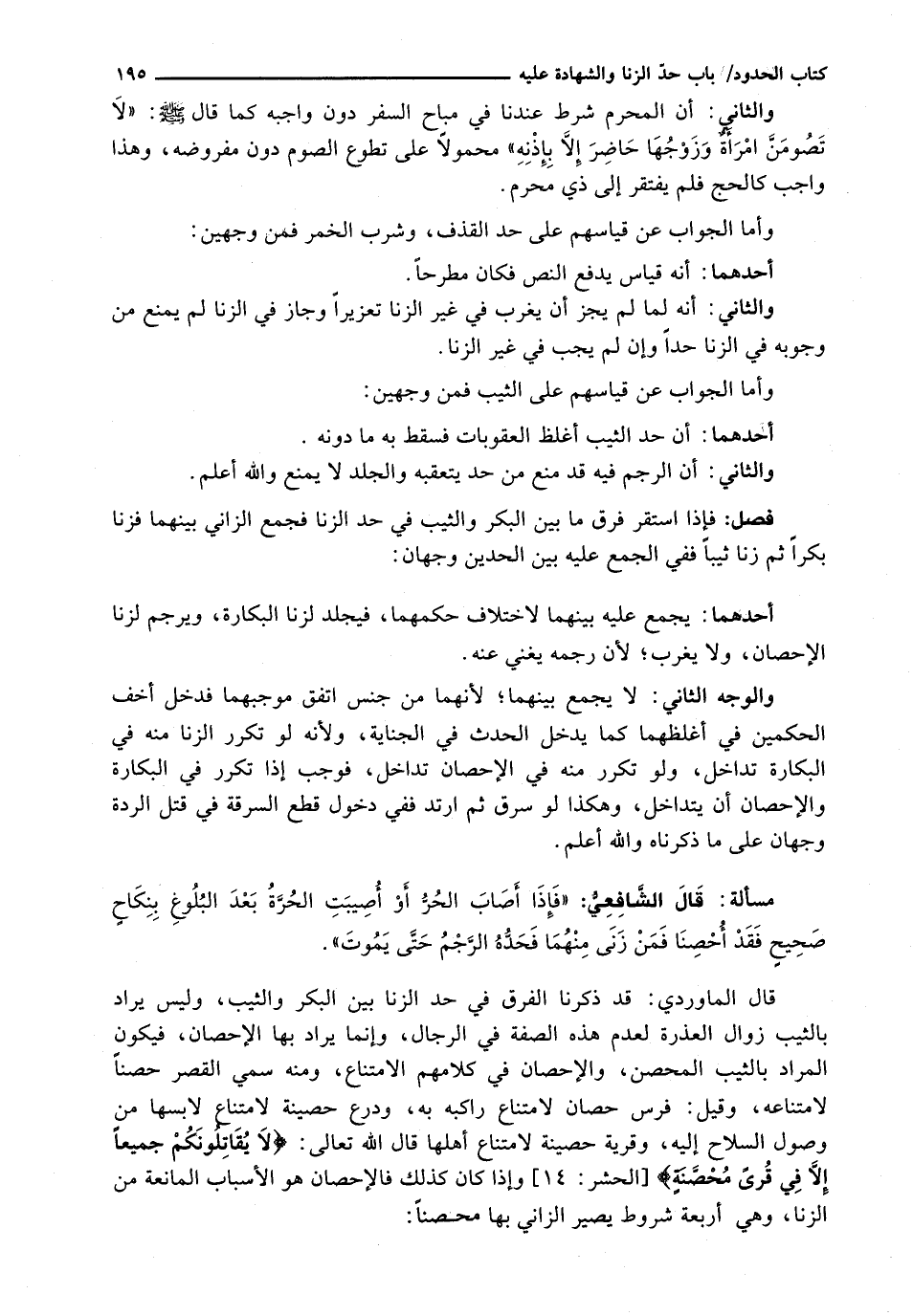 قَالَ الْمَاوَرْدِيُّ: قَدْ ذَكَرْنَا الْفَرْقَ فِي حَدِّ الزِّنَا بَيْنَ الْبِكْرِ وَالثَّيِّبِ، وَلَيْسَ يُرَادُ بِالثَّيِّبِ زَوَالُ الْعُذْرَةِ لِعَدَمِ هَذِهِ الصِّفَةِ فِي الرِّجَالِ، وَإِنَّمَا يُرَادُ بِهَا الْإِحْصَانُ، فَيَكُونُ الْمُرَادُ بِالثَّيِّبِ الْمُحْصَنُ، وَالْإِحْصَانُ فِي كَلَامِهِمُ الِامْتِنَاعُ، وَمِنْهُ سُمِّي الْقَصْرُ حِصْنًا لِامْتِنَاعِهِ، وقيل: فرس حَصَانٌ لِامْتِنَاعِ رَاكِبِهِ بِهِ، وَدِرْعٌ حَصِينَةٌ لِامْتِنَاعِ لَابِسِهَا مِنْ وُصُولِ السِّلَاحِ إِلَيْهِ، وَقَرْيَةٌ حَصِينَةٌ لامتناع أهلها قَالَ اللَّهُ تَعَالَى: {لا يُقَاتِلُونَكُمْ جَمِيعًا إِلا فِي قُرًى مُحَصَّنَةٍ} [الحشر: 14] وَإِذَا كَانَ كَذَلِكَ فَالْإِحْصَانُ هُوَ الْأَسْبَابُ الْمَانِعَةُ مِنَ الزِّنَا، وَهِيَ أربعة شروط يصير الزاني بها محصناً: