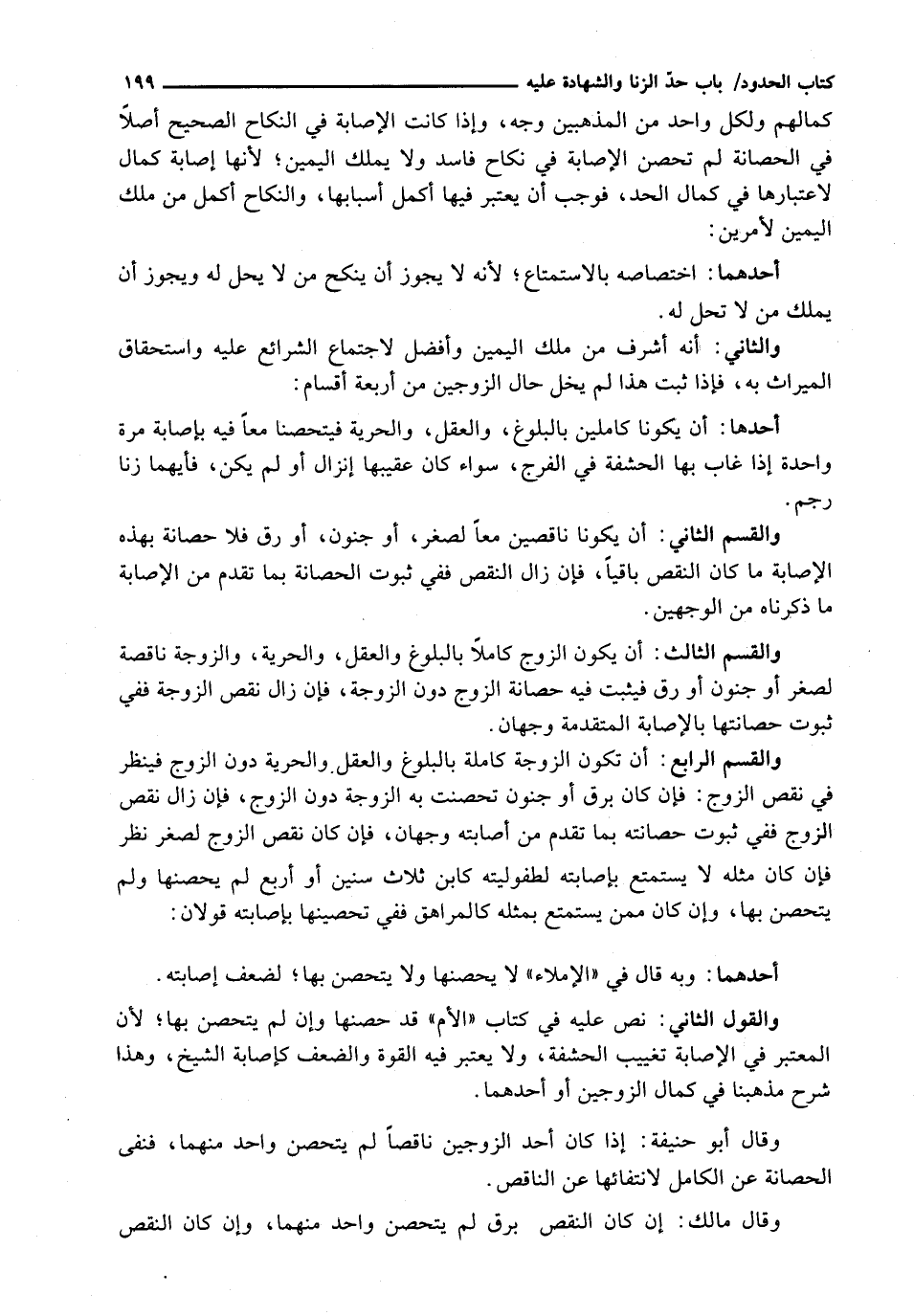 كَمَالِهِمْ وَلِكُلِّ وَاحِدٍ مِنَ الْمَذْهَبَيْنِ وَجْهٌ، وَإِذَا كَانَتِ الْإِصَابَةُ فِي النِّكَاحِ الصَّحِيحِ أَصْلًا فِي الْحَصَانَةِ لَمْ تُحْصَنِ الْإِصَابَةُ فِي نِكَاحٍ فَاسِدٍ ولا يملك الْيَمِينِ؛ لِأَنَّهَا إِصَابَةُ كَمَالٍ لِاعْتِبَارِهَا فِي كَمَالِ الْحَدِّ، فَوَجَبَ أَنْ يُعْتَبَرَ فِيهَا أَكْمَلَ أَسْبَابِهَا، وَالنِّكَاحُ أَكْمَلُ مِنْ مِلْكِ الْيَمِينِ لِأَمْرَيْنِ: